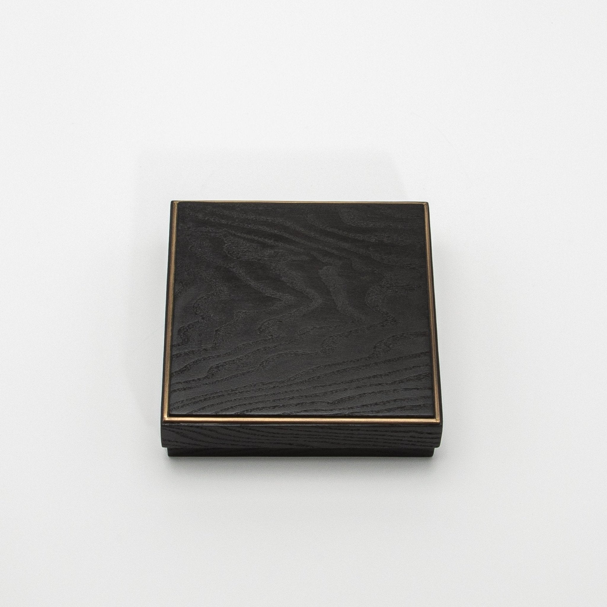 The set of three square boxes in black oak with a brass frame by R&Y Augousti presents a refined yet minimalist design that exudes modern luxury. The rich black oak wood is meticulously handcrafted, showcasing the natural grain of the wood for a subtle texture that contrasts elegantly with the gleaming brass frame, which delicately outlines each box. The interior, crafted from warm-toned wood, provides a harmonious balance between dark and light hues. This design, marked by its clean lines and natural materials, is a testament to the craftsmanship and understated elegance that defines R&Y Augousti. Perfect for adding a sophisticated touch to any space, these boxes are a functional and stylish way to store personal treasures.