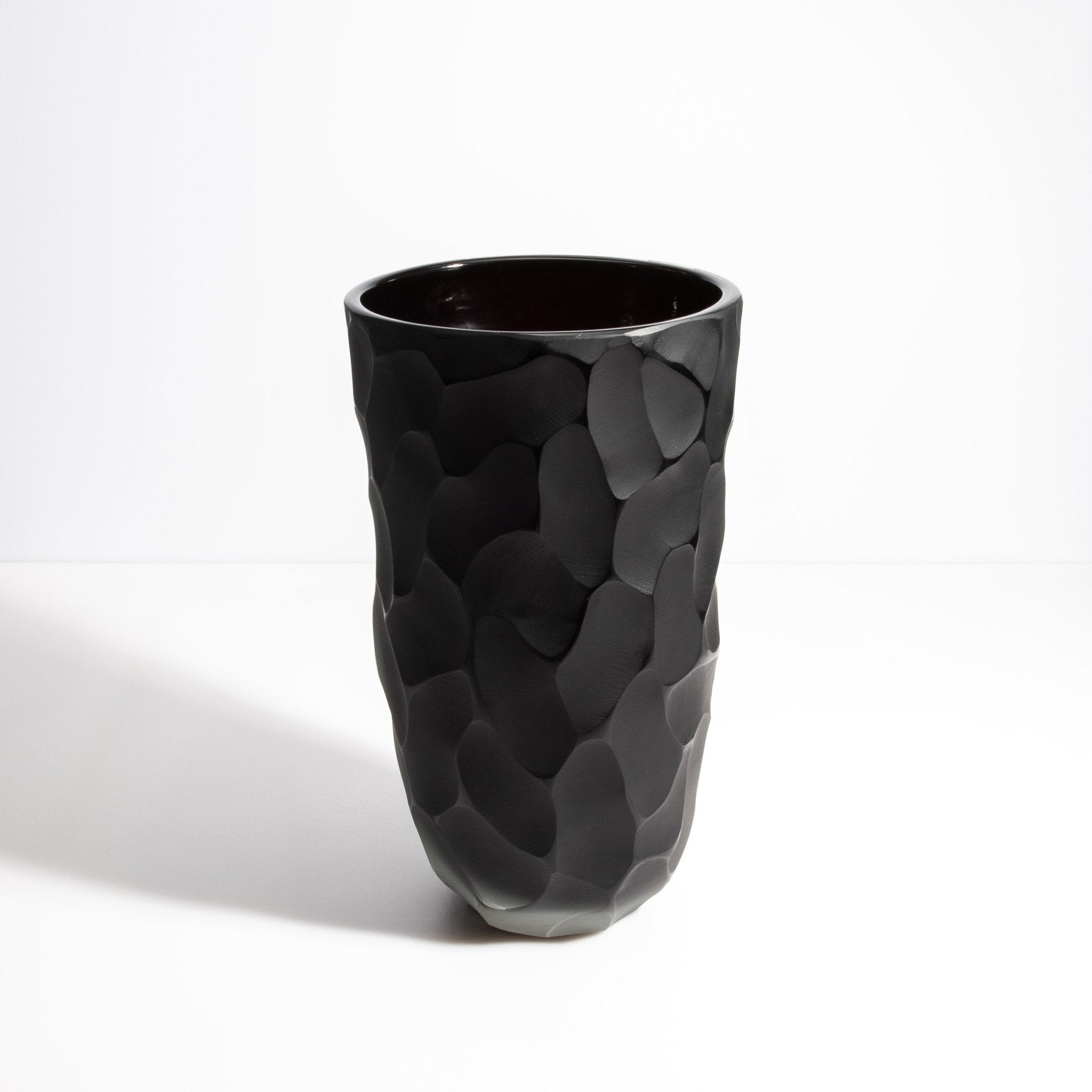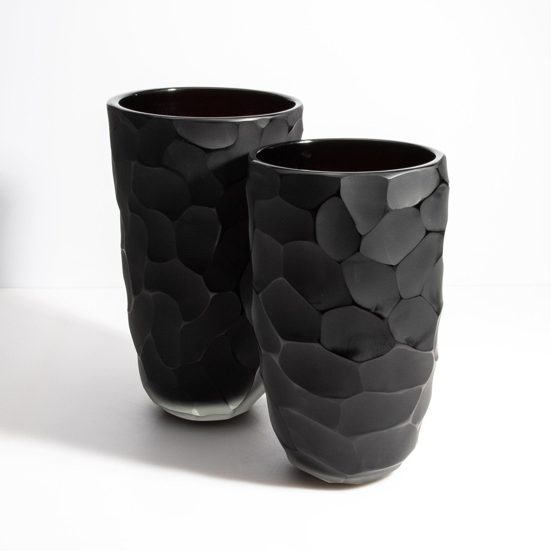 This exquisite set of 2 vases features a luxurious matte black exterior with polished beveled edges that mimic the texture of moon rocks, creating a striking visual and tactile experience. It's a perfect blend of modern sophistication and timeless elegance.