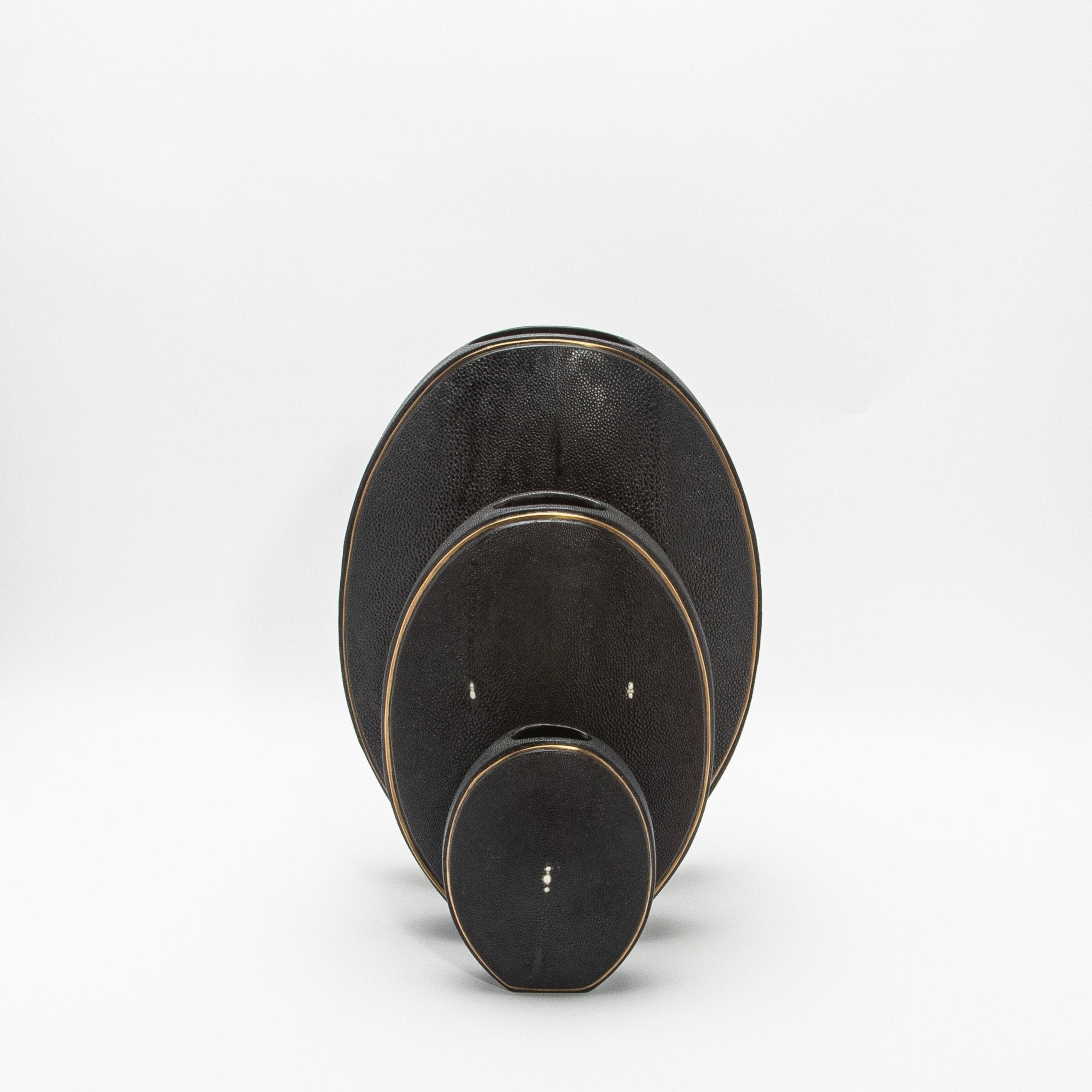 The elegant "Oval Vase" by R&Y Augousti, crafted in shagreen and accented with brass, is a sophisticated fusion of organic texture and luxurious detail. Its oval silhouette presents a striking form, enhanced by the meticulous placement of handcrafted shagreen that showcases the unique pebble-like surface. The edges are gracefully framed with brass, adding a warm, metallic glow that complements the deep, rich hue of the shagreen. The vase exudes understated elegance, making it a captivating centerpiece for any modern interior, blending artisanal craftsmanship with timeless design elements.