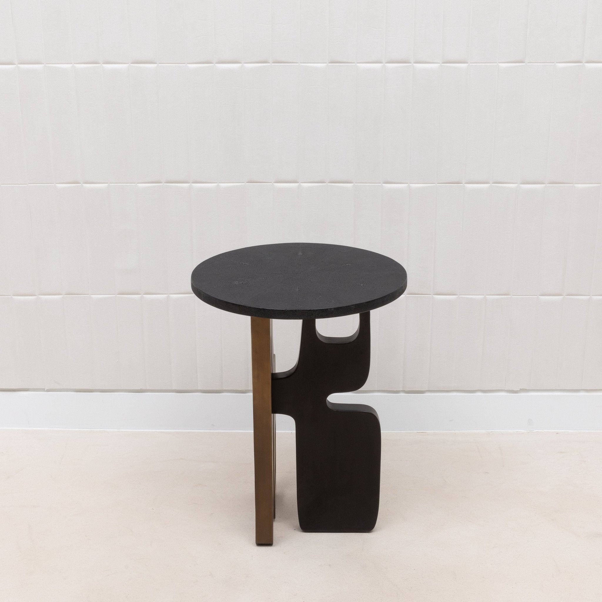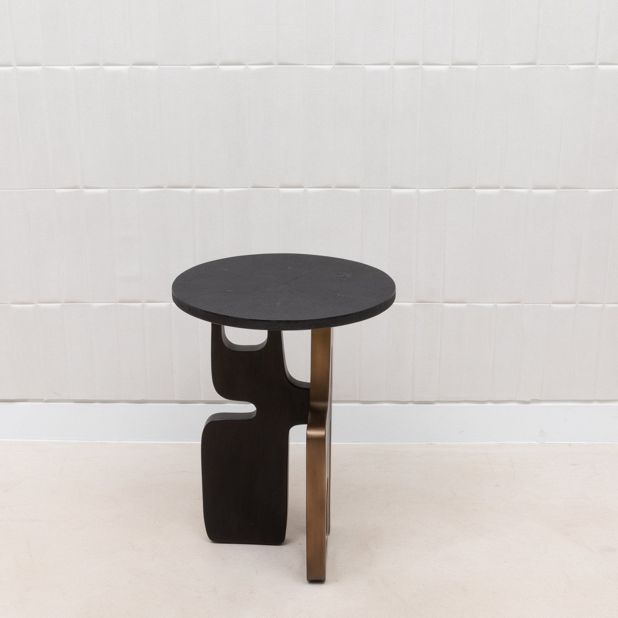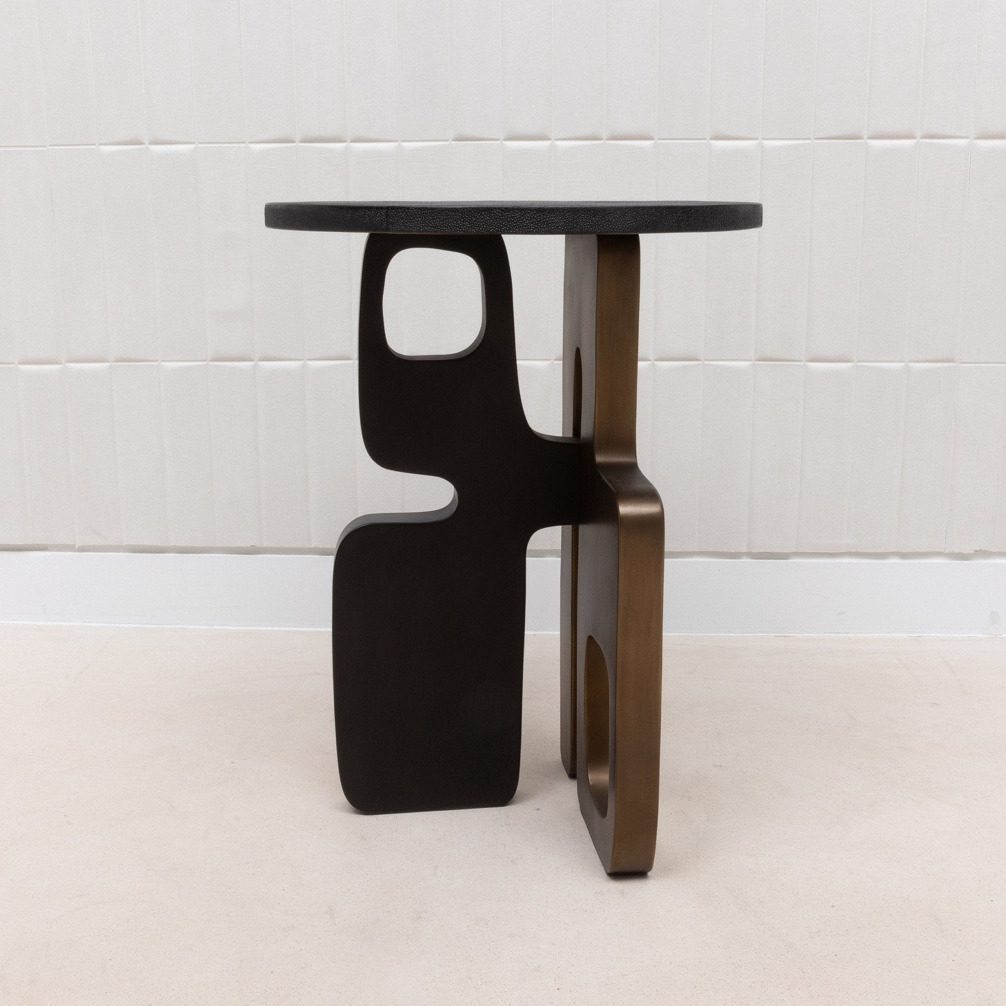 The Apoli Side Table by Kifu Paris is a striking blend of bold modern design and luxurious materials. Its top, crafted from deep black shagreen, provides a sleek, sophisticated surface that contrasts beautifully with the intricate base. The base itself, a dynamic composition of bronze patina and black brass, forms a sculptural masterpiece that evokes the elegance of modernist art. Handcrafted and meticulously hand-painted, this table not only serves as a functional piece but stands as a testament to exquisite craftsmanship and contemporary elegance, destined to be the centerpiece of any room.