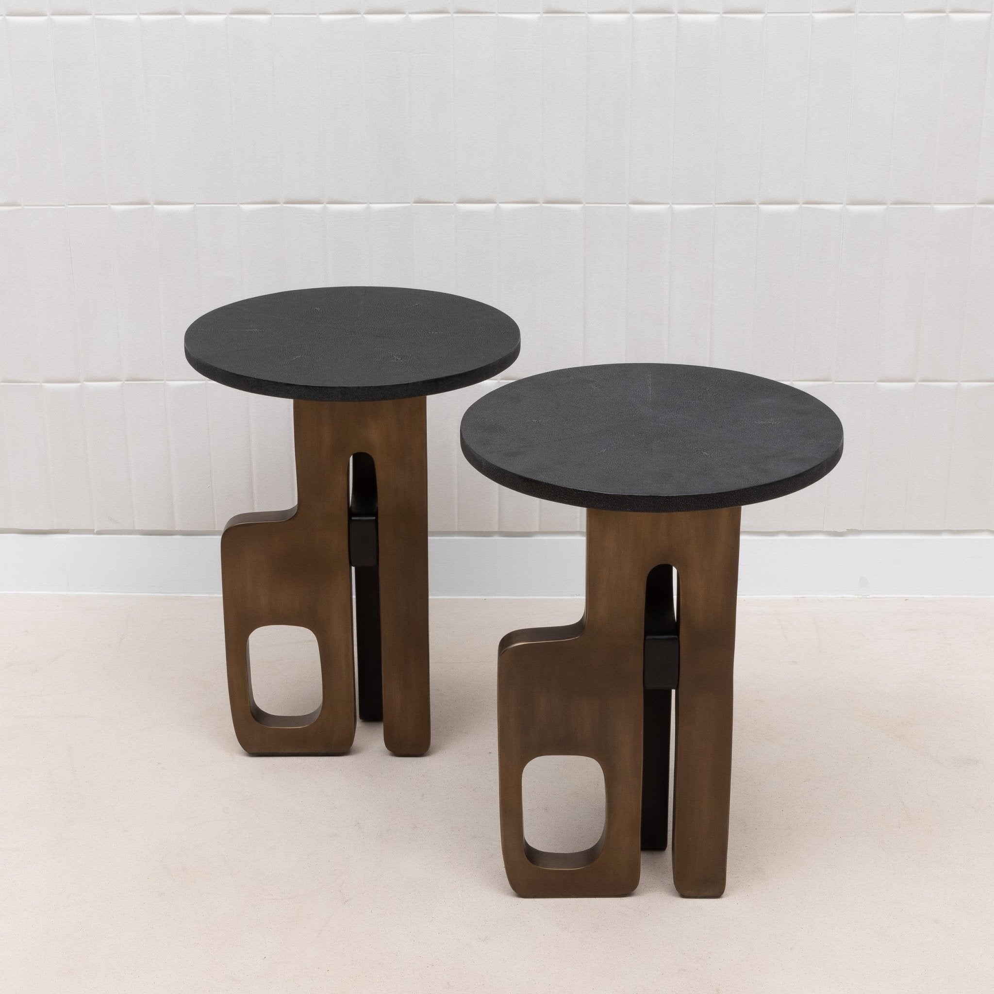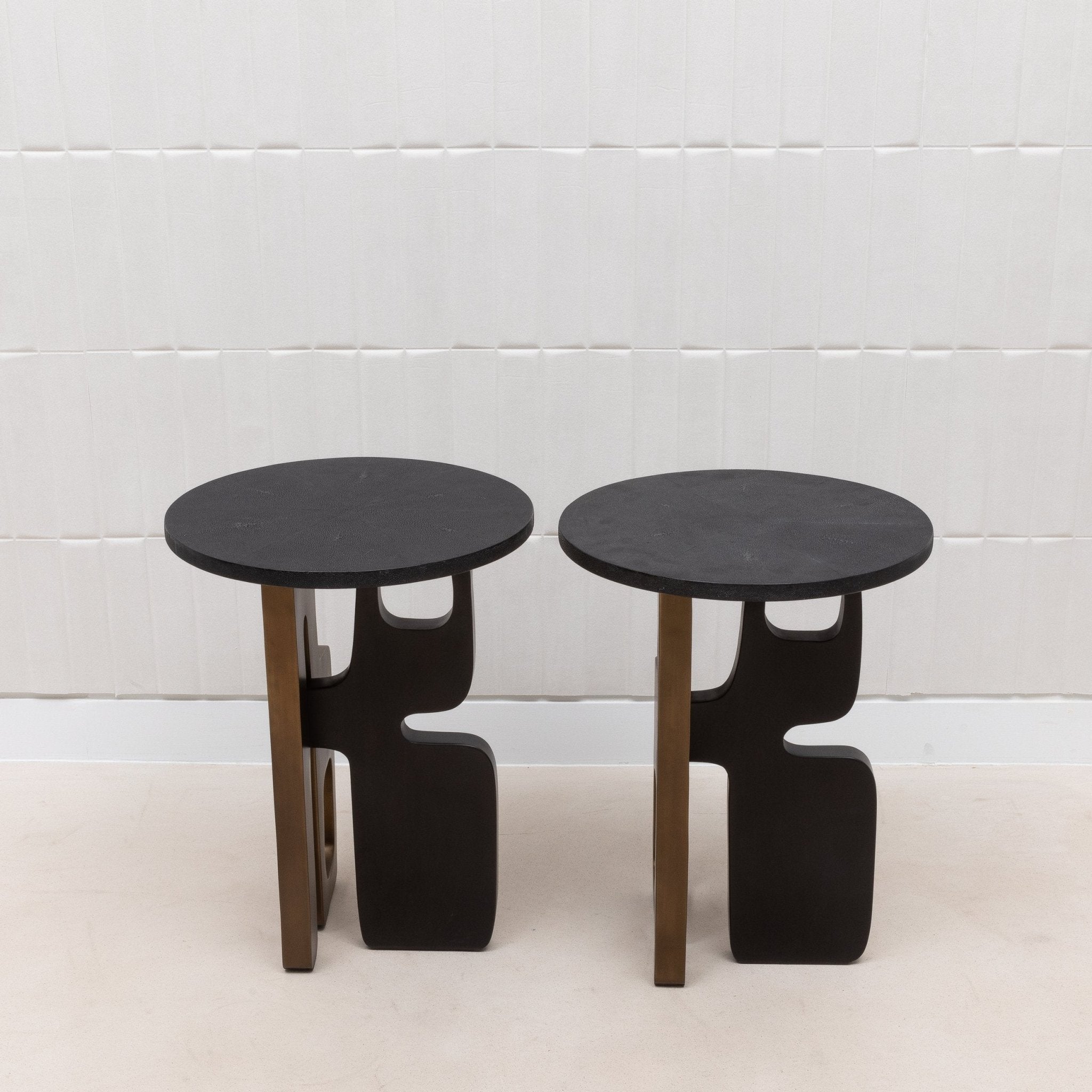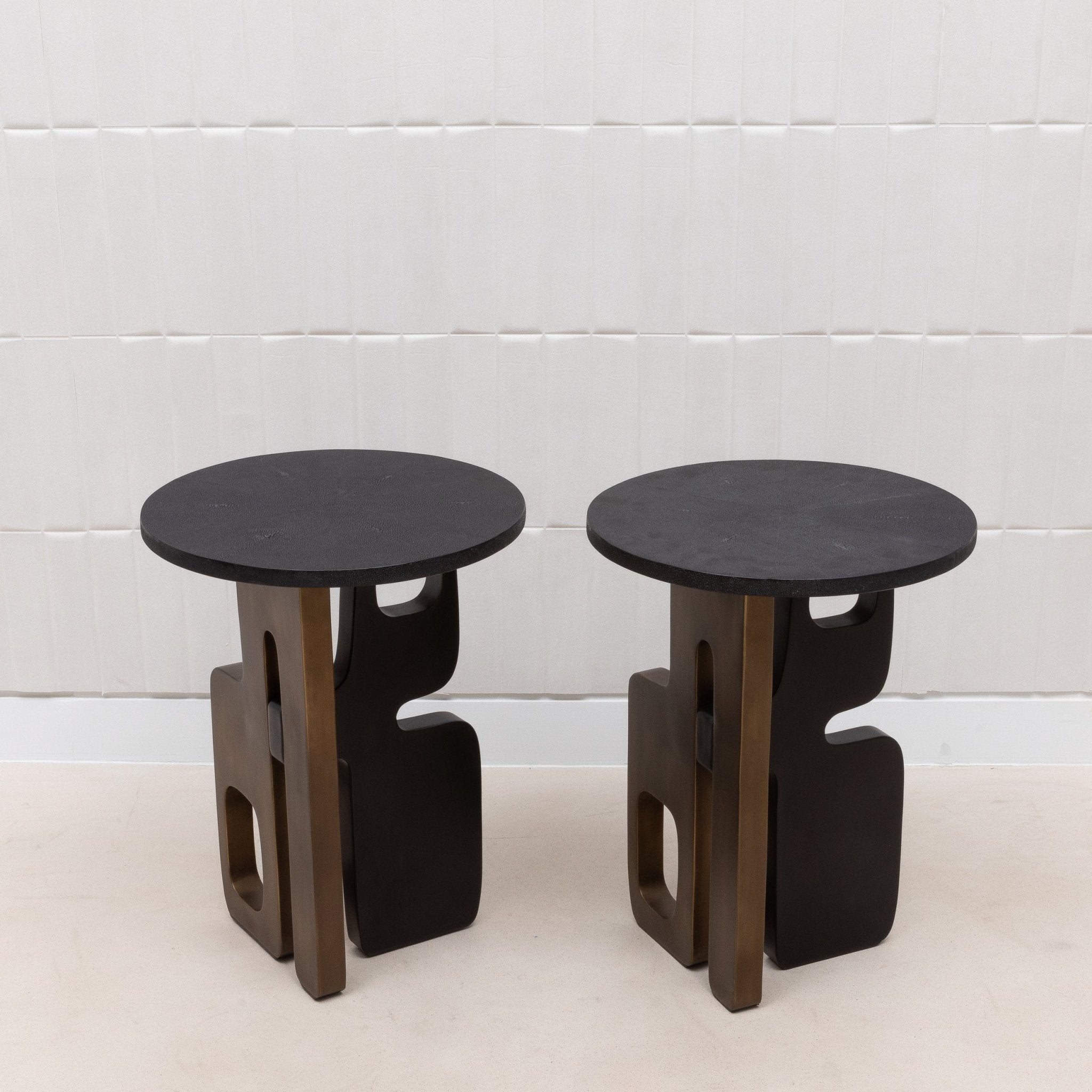 The Apoli Side Table by Kifu Paris is a striking blend of bold modern design and luxurious materials. Its top, crafted from deep black shagreen, provides a sleek, sophisticated surface that contrasts beautifully with the intricate base. The base itself, a dynamic composition of bronze patina and black brass, forms a sculptural masterpiece that evokes the elegance of modernist art. Handcrafted and meticulously hand-painted, this table not only serves as a functional piece but stands as a testament to exquisite craftsmanship and contemporary elegance, destined to be the centerpiece of any room.