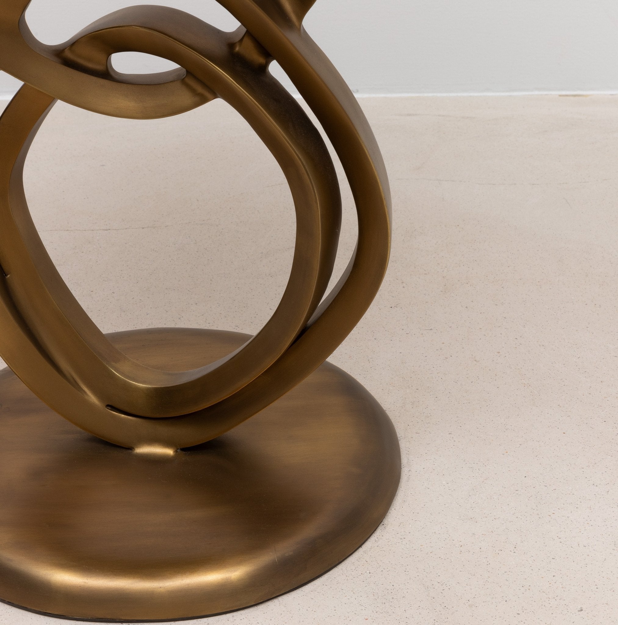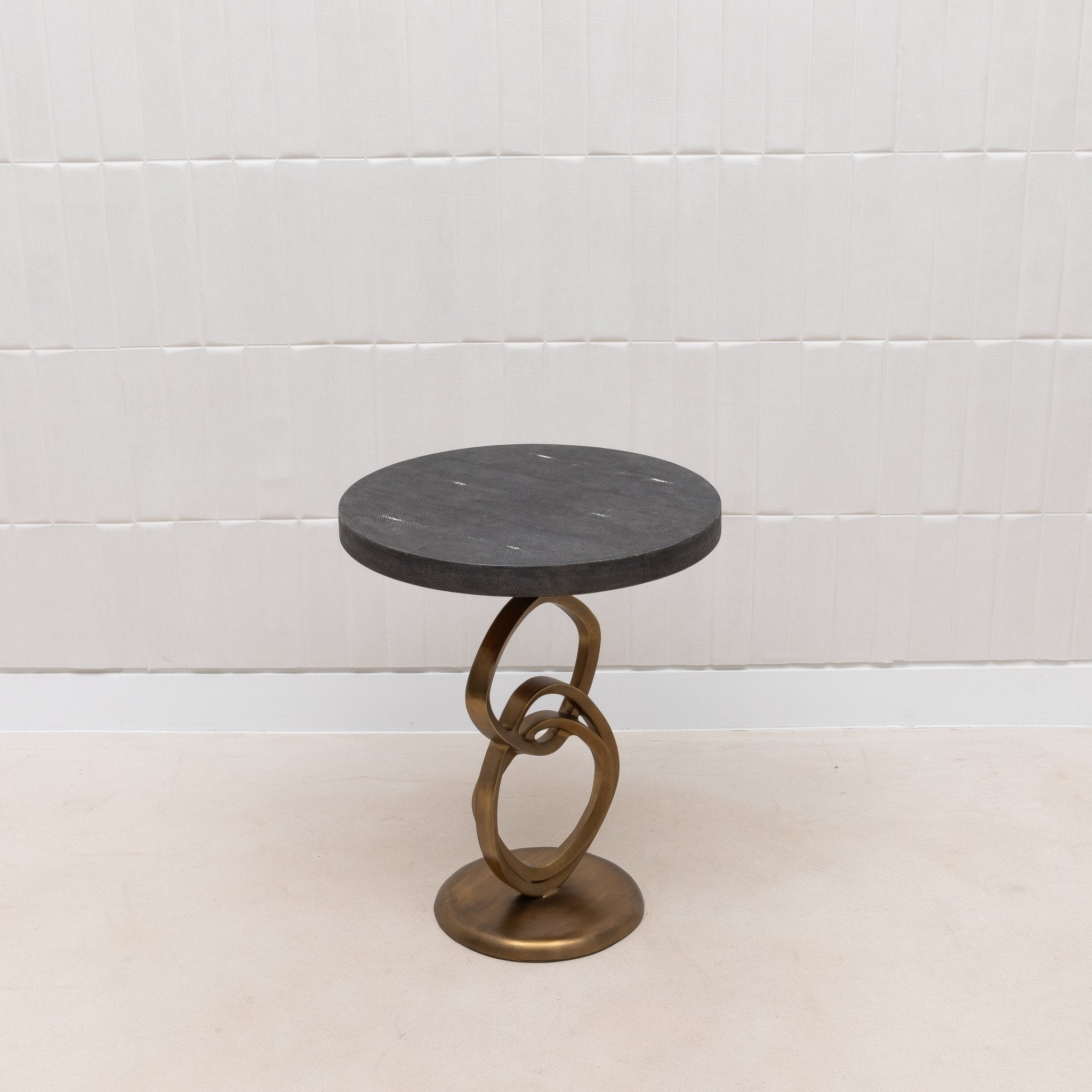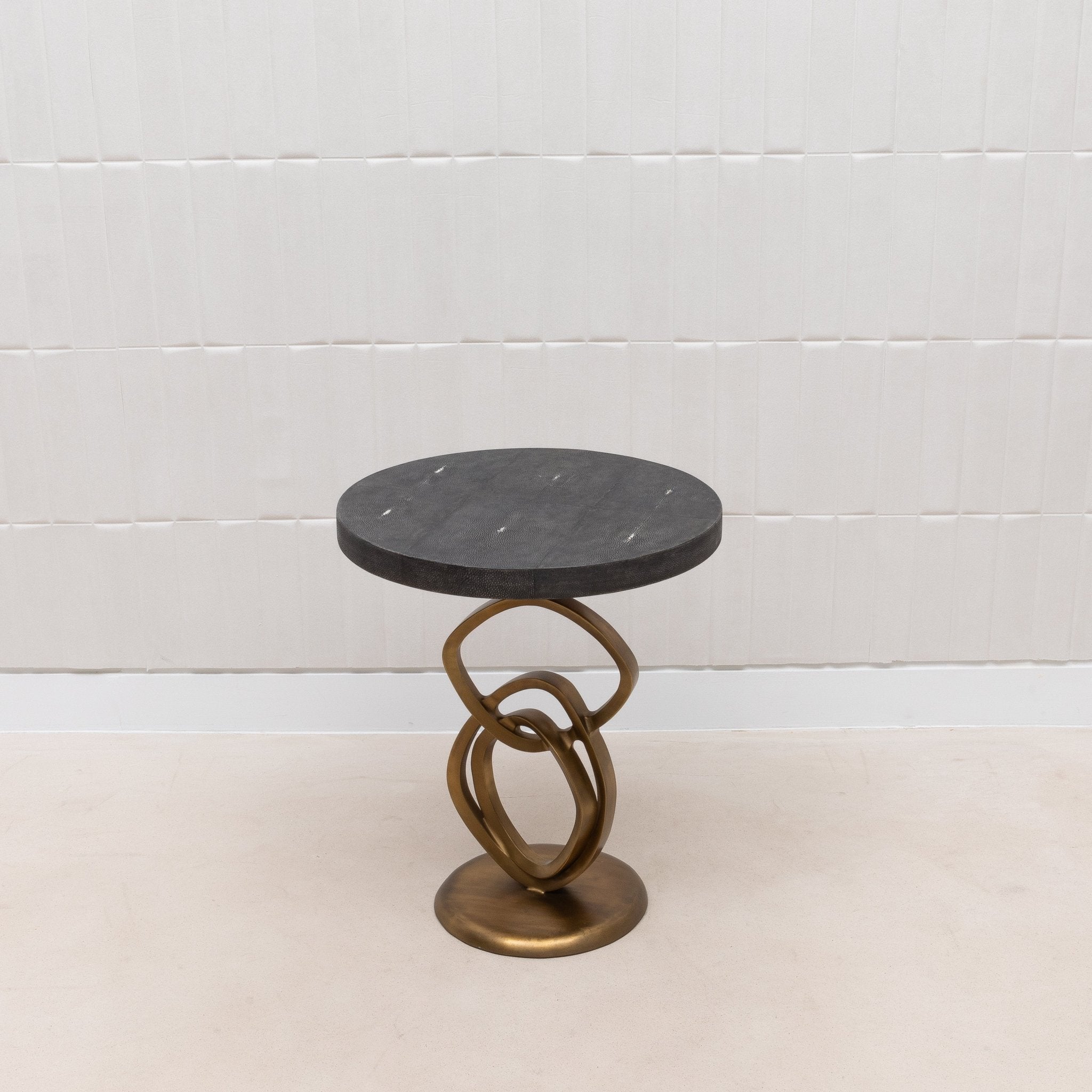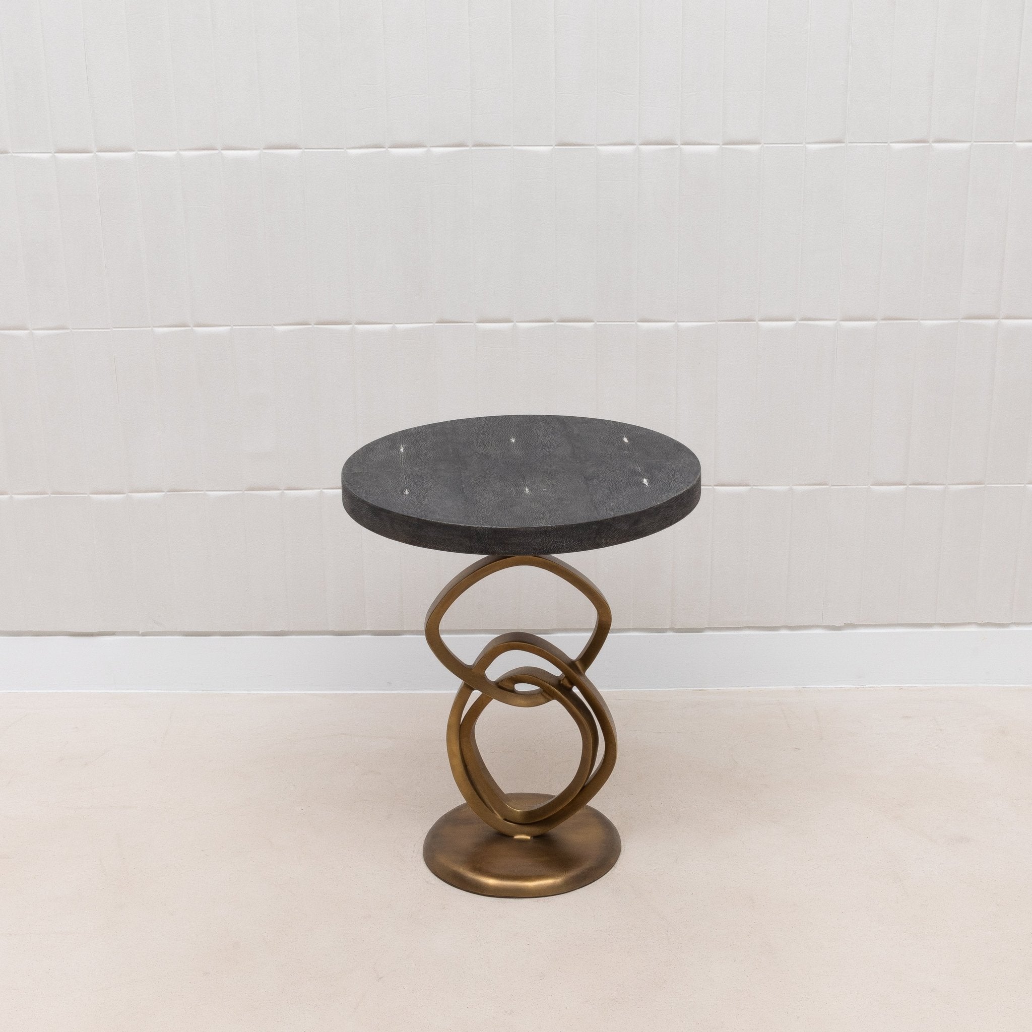 The Teardrop Side Table in Coal Black Shagreen by Kifu Paris is a striking embodiment of modern luxury and artistic finesse. The deep, textured shagreen surface in a sophisticated coal black hue contrast beautifully with the sculptural bronze patina brass base, creating a piece that is both visually captivating and impeccably crafted. The intertwined teardrop design of the base adds an element of fluidity and grace, making this side table not just a functional piece but a statement of refined elegance. Perfect for those who appreciate the blend of contemporary design with timeless materials, this table is a luxurious addition to any space.