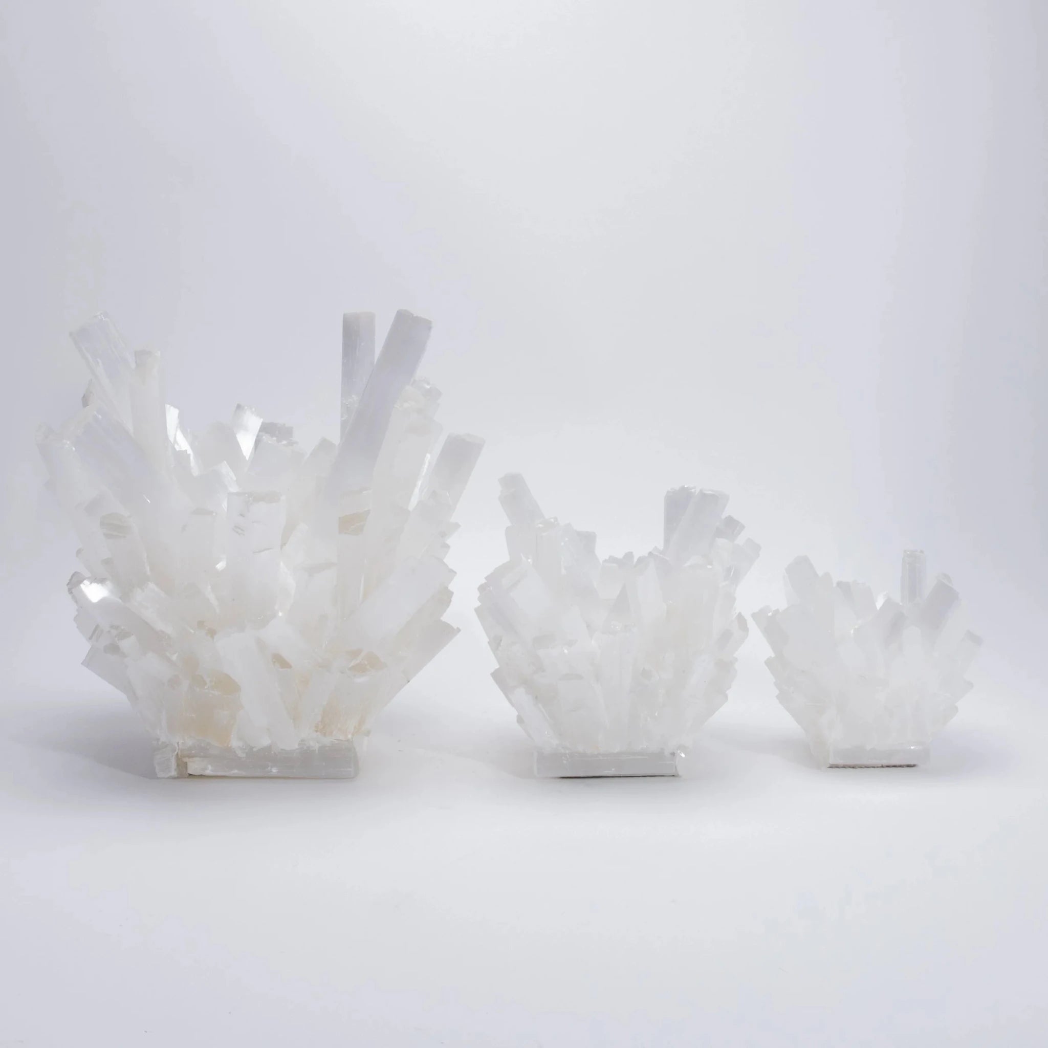 While ideal for orchids and sculptural greenery, this vessel is equally striking styled without plants. The translucent selenite softly captures and diffuses light, creating a gentle glow that enhances its layered crystal formations. It may also be used to hold larger candles, where the flame illuminates the stone from within, producing a serene and atmospheric effect.