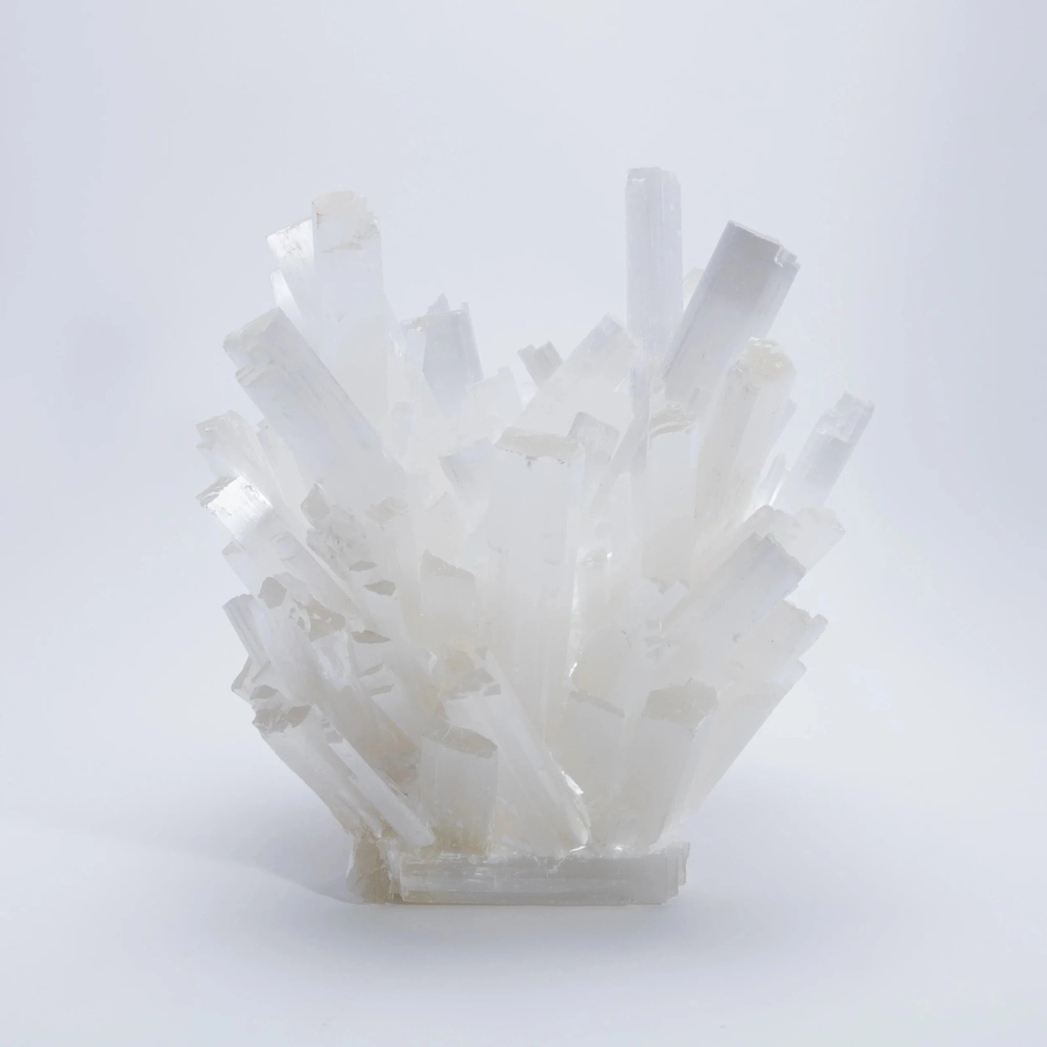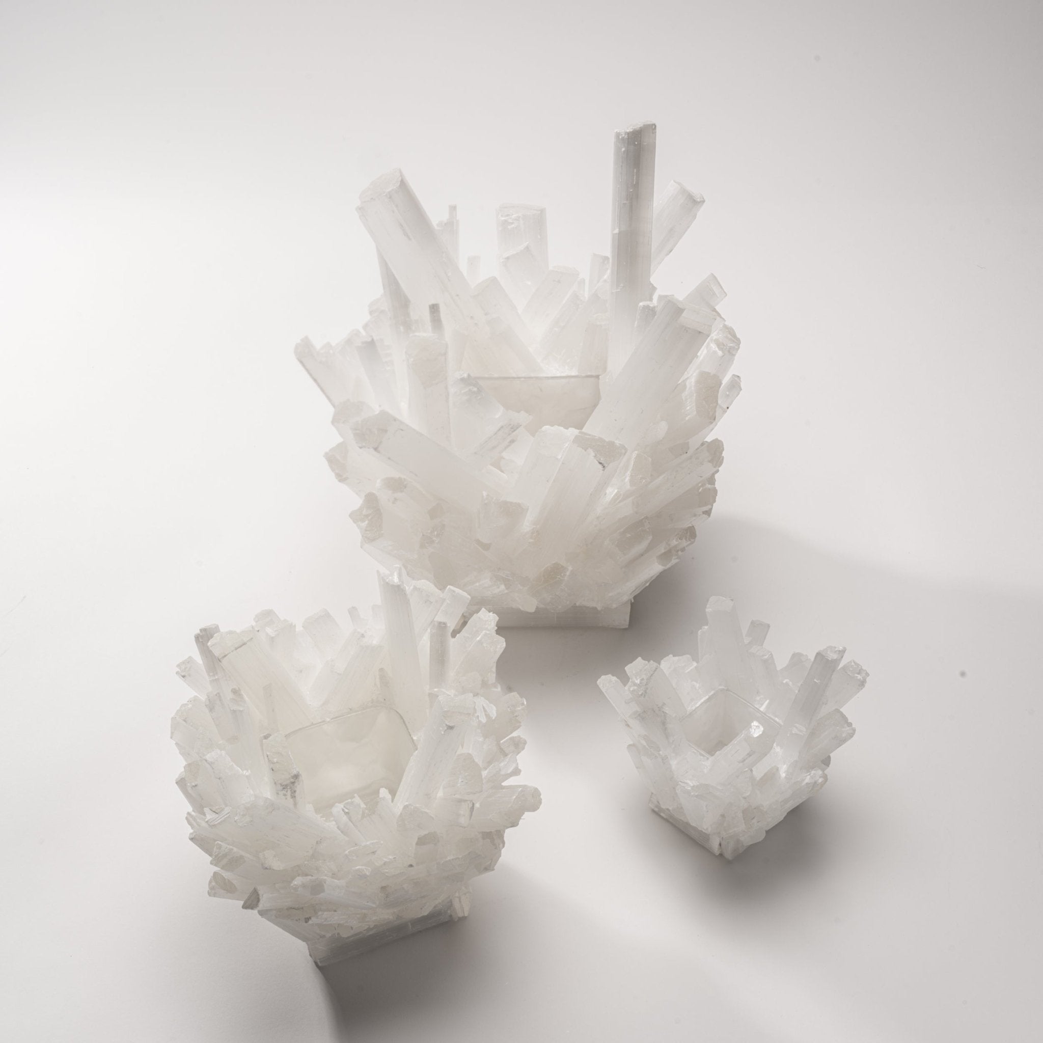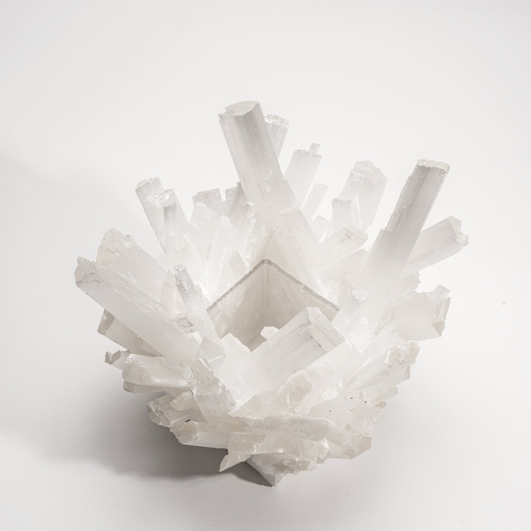 The Selenite Planter Vessel by Kathryn McCoy is a luminous sculptural vessel carved from radiant natural selenite. Formed from crystalline blades that rise organically around the perimeter, each piece reveals the stone’s natural striations, translucency, and architectural structure. No two are ever alike, making every planter a singular mineral composition shaped by nature and refined through hand craftsmanship.
