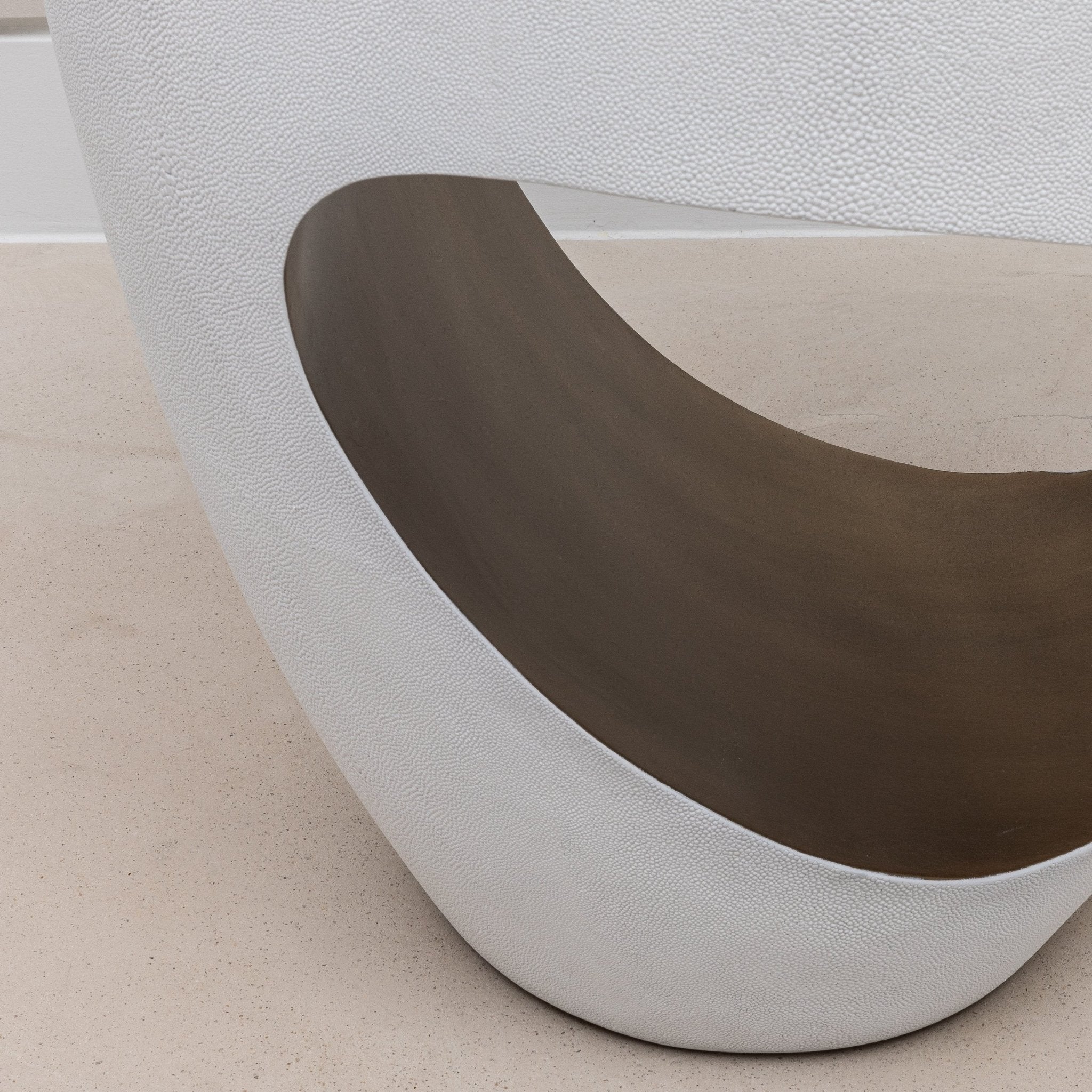 The Eclipse Stool by R&Y Augousti is a striking fusion of art and functionality, wrapped in luxurious natural antique shagreen and accented with a bronze patina brass interior. The stool’s bold, sculptural design is characterized by its unique, hollowed-out shape, which creates a sense of lightness and fluidity despite its solid construction. Meticulously hand-crafted, this piece is as much a work of art as it is a functional piece of furniture, making it a perfect addition to any modern or contemporary space. Its elegant form and luxurious materials make the Eclipse Stool a standout piece that elevates the ambiance of any room.