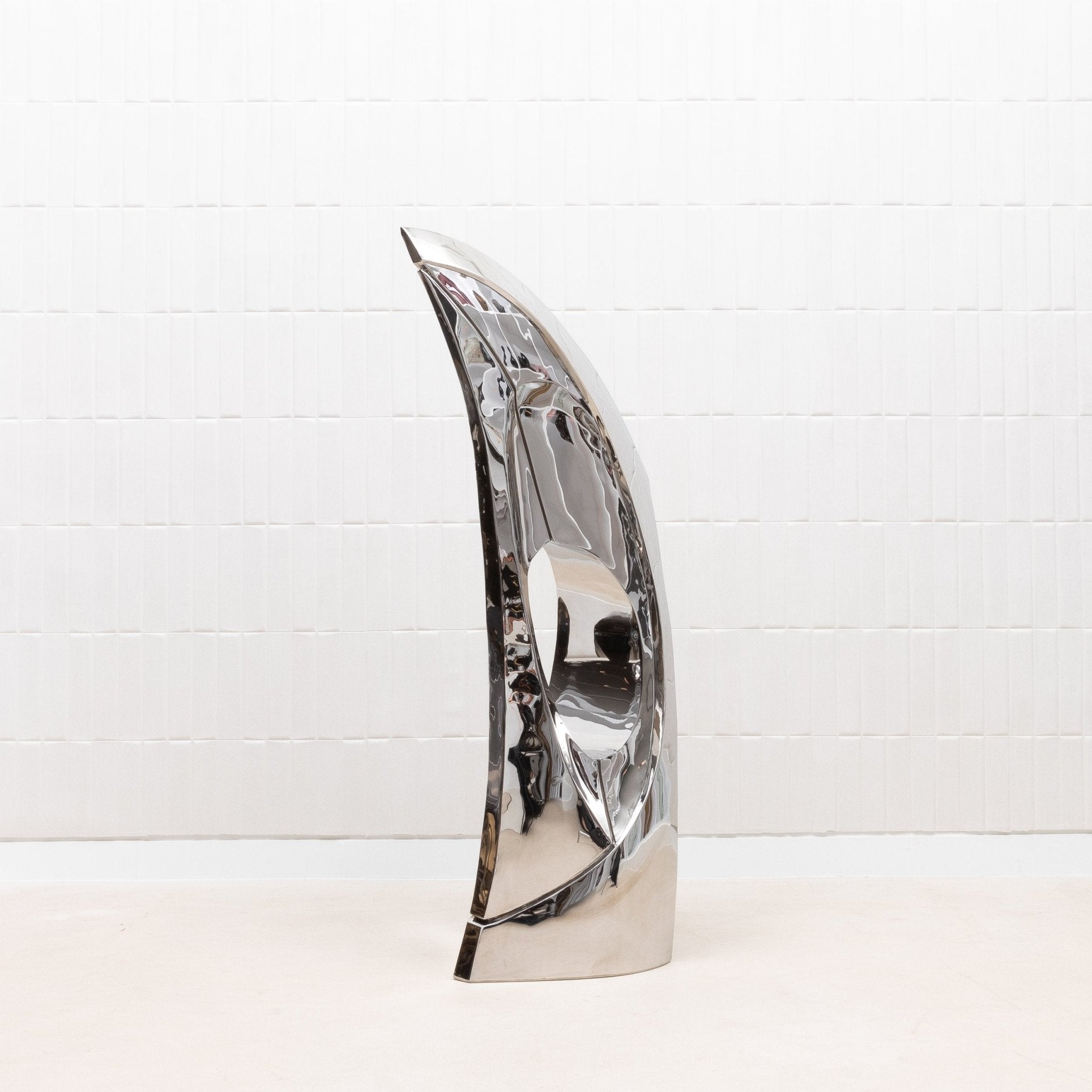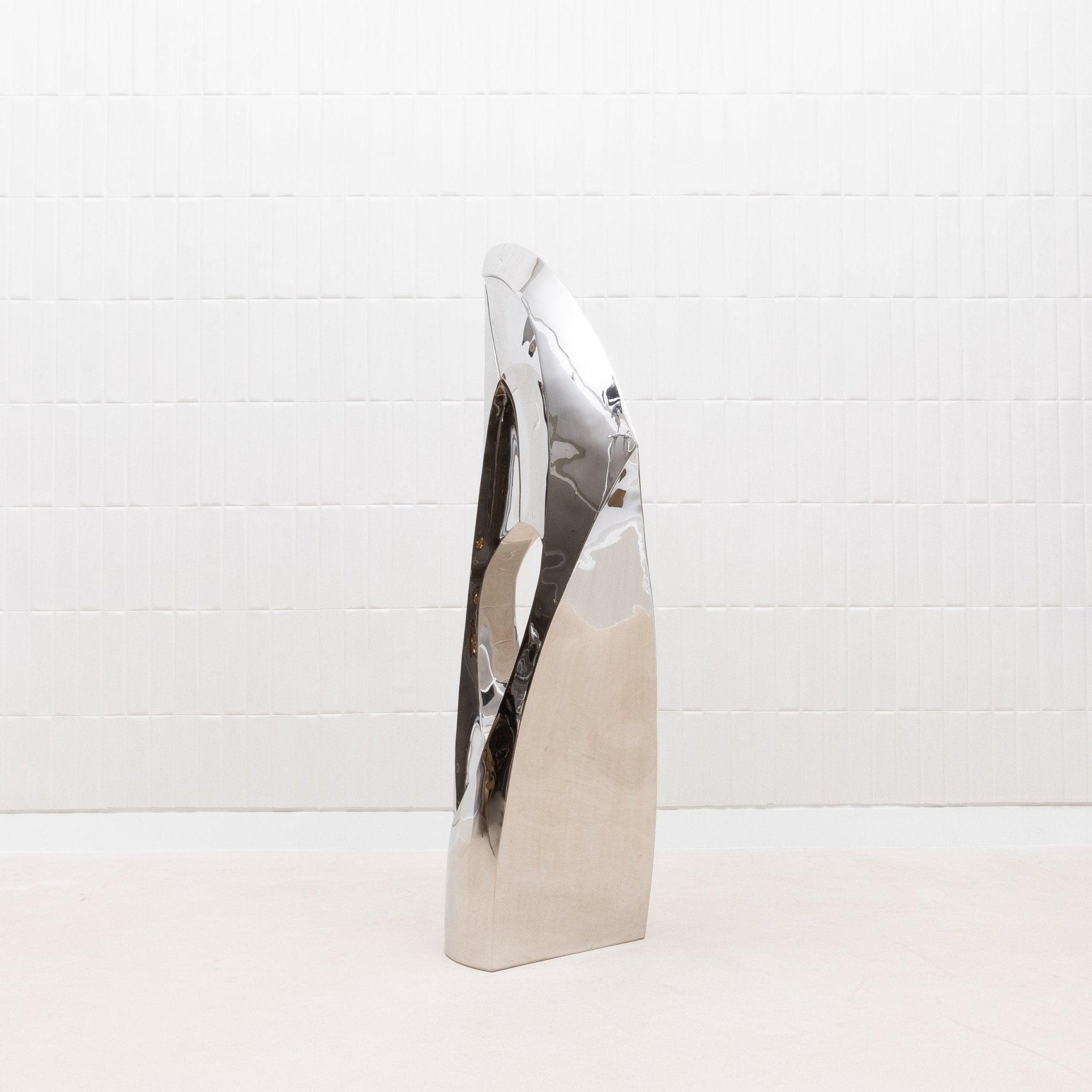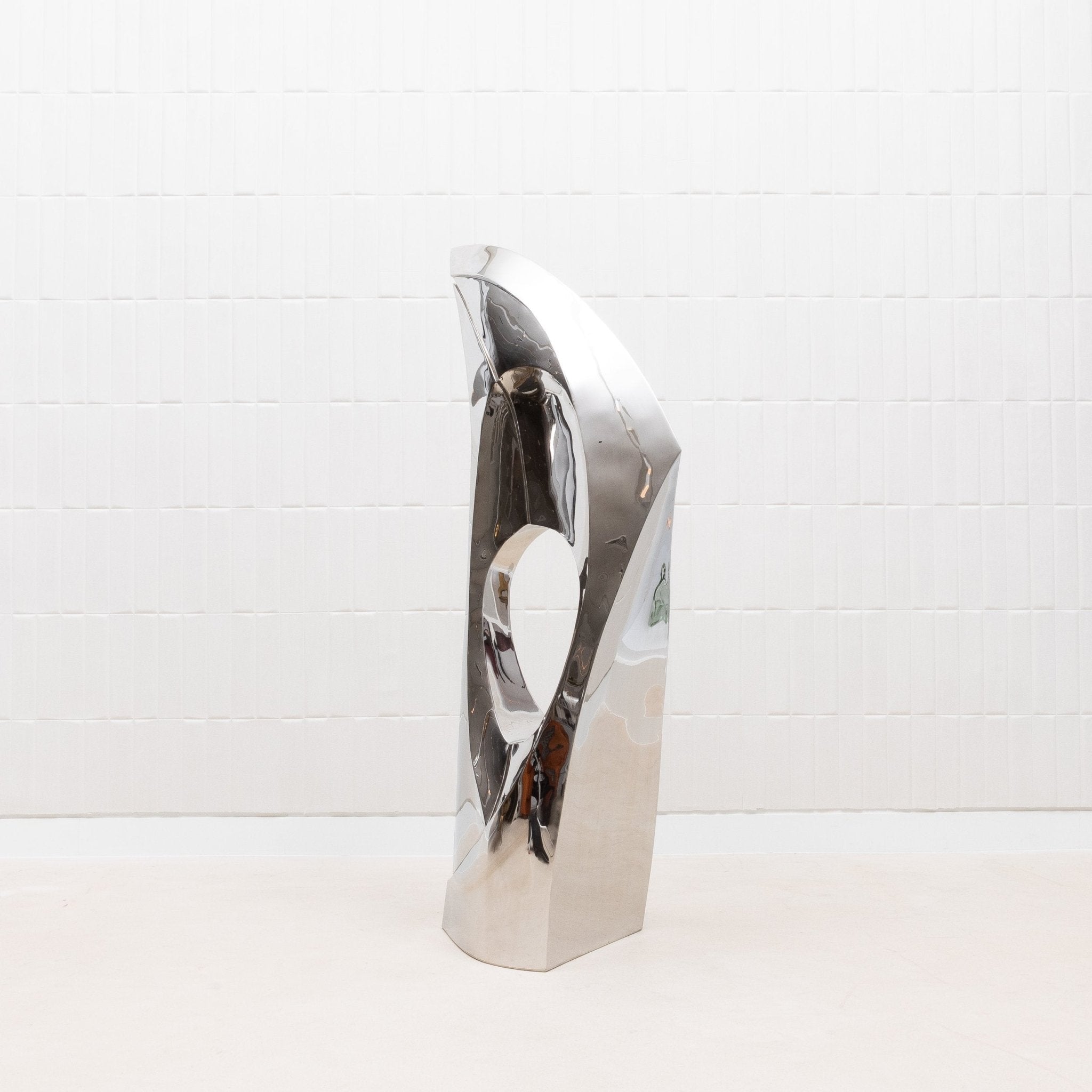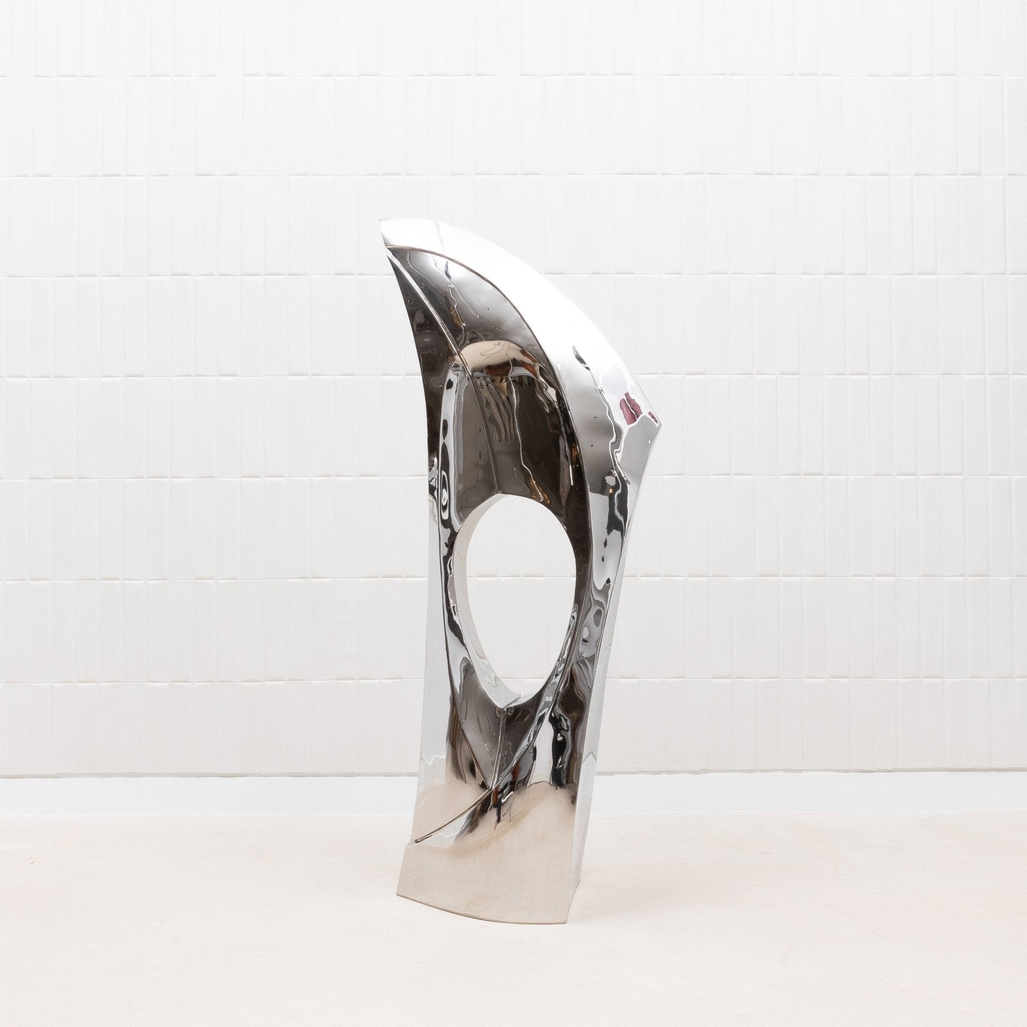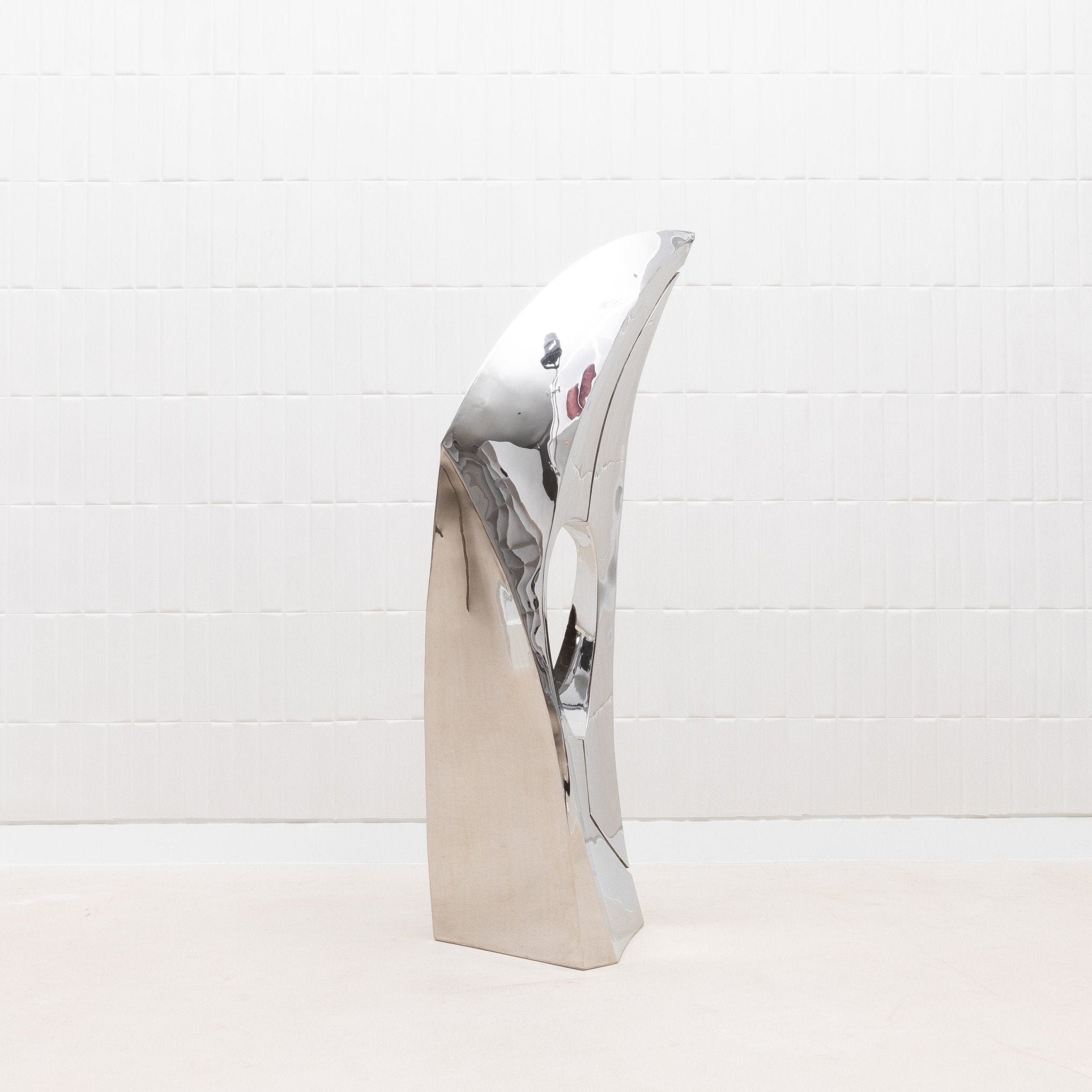 The "GOLDEN RATIO" sculpture by Patrick Coard Paris is a striking embodiment of modern elegance, meticulously crafted from a polished stainless steel veneer inlaid on a fiberglass core. Its nearly 65-inch tall form features fluid, sweeping curves that reflect the timeless beauty of the golden ratio, creating a piece that resonates with harmony and balance. The highly reflective surface of the polished stainless steel adds a dynamic, almost ethereal quality, capturing and transforming light in a mesmerizing dance. This exquisite finish, while challenging to photograph, only enhances the sculpture's allure, making it a true statement piece for those who appreciate the intersection of luxury, art, and mathematical perfection.