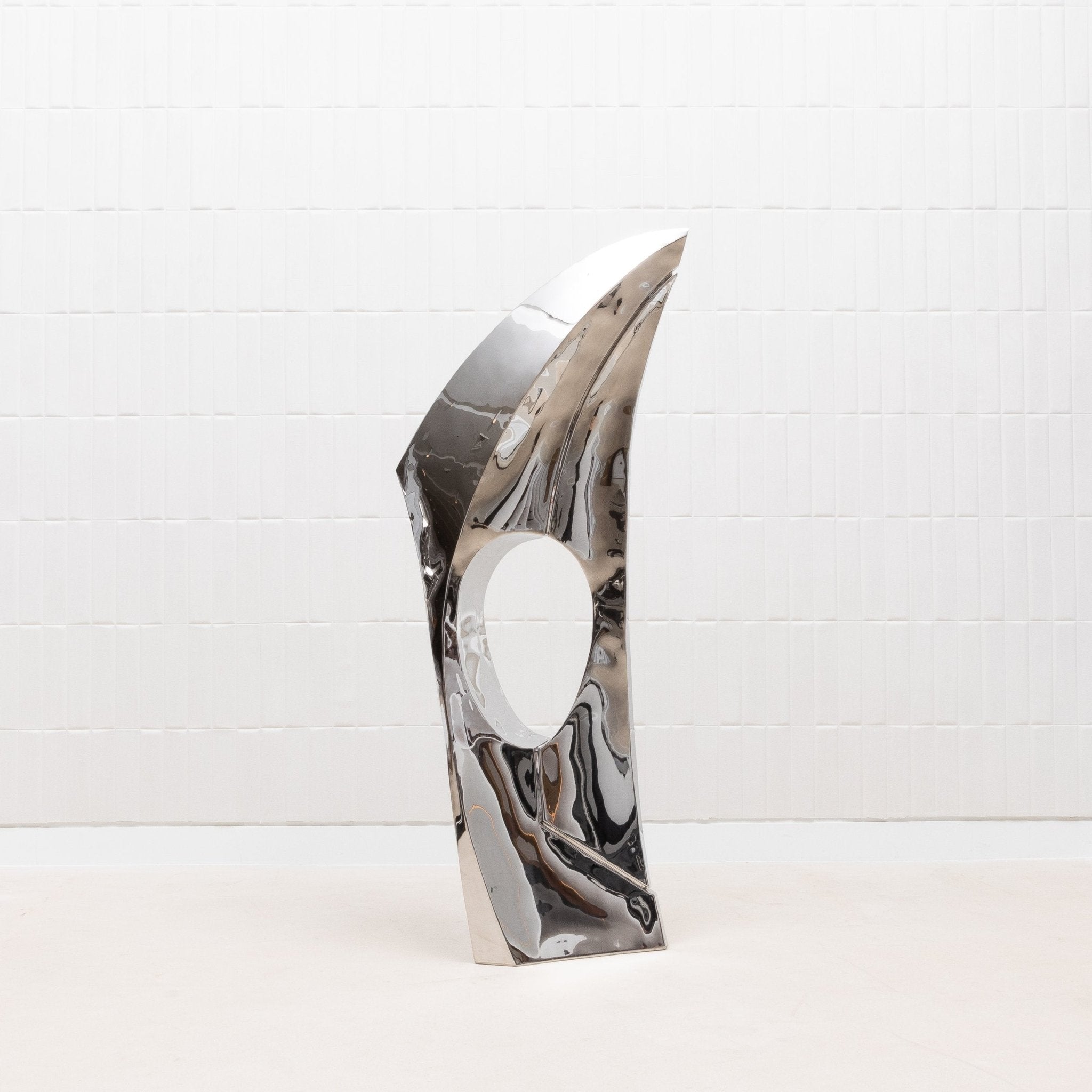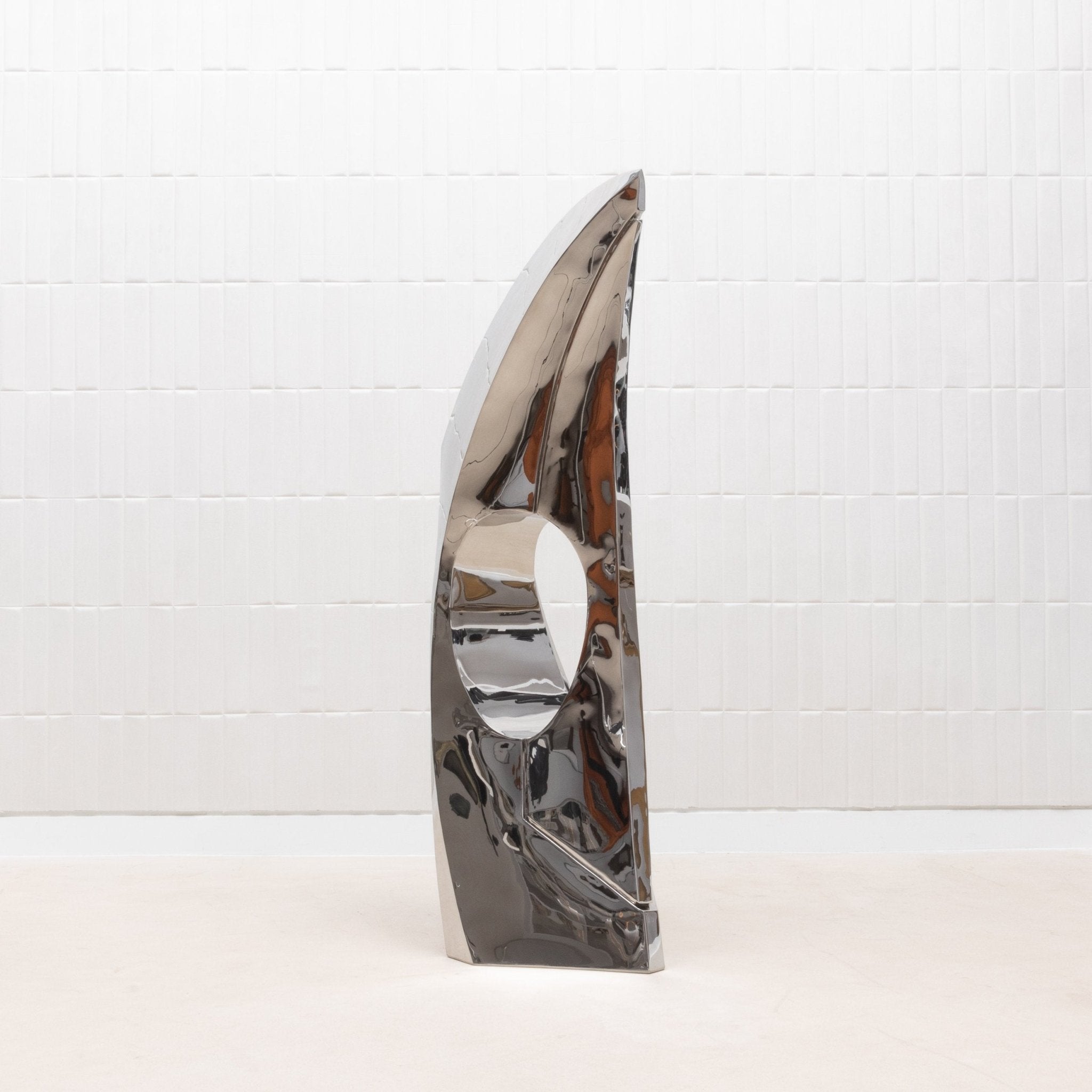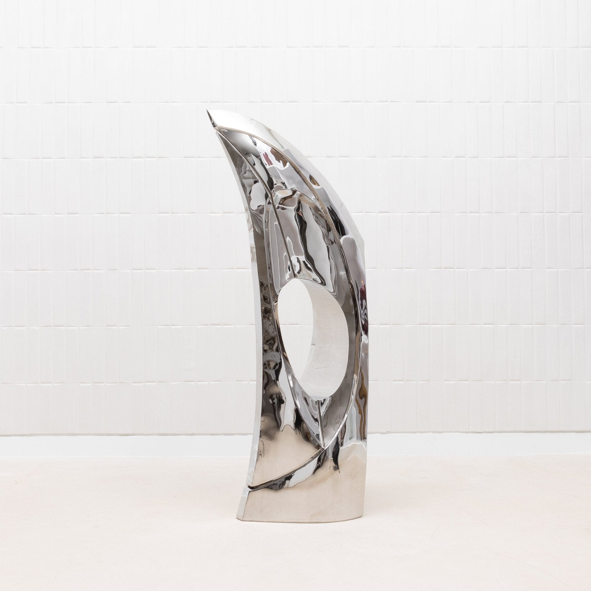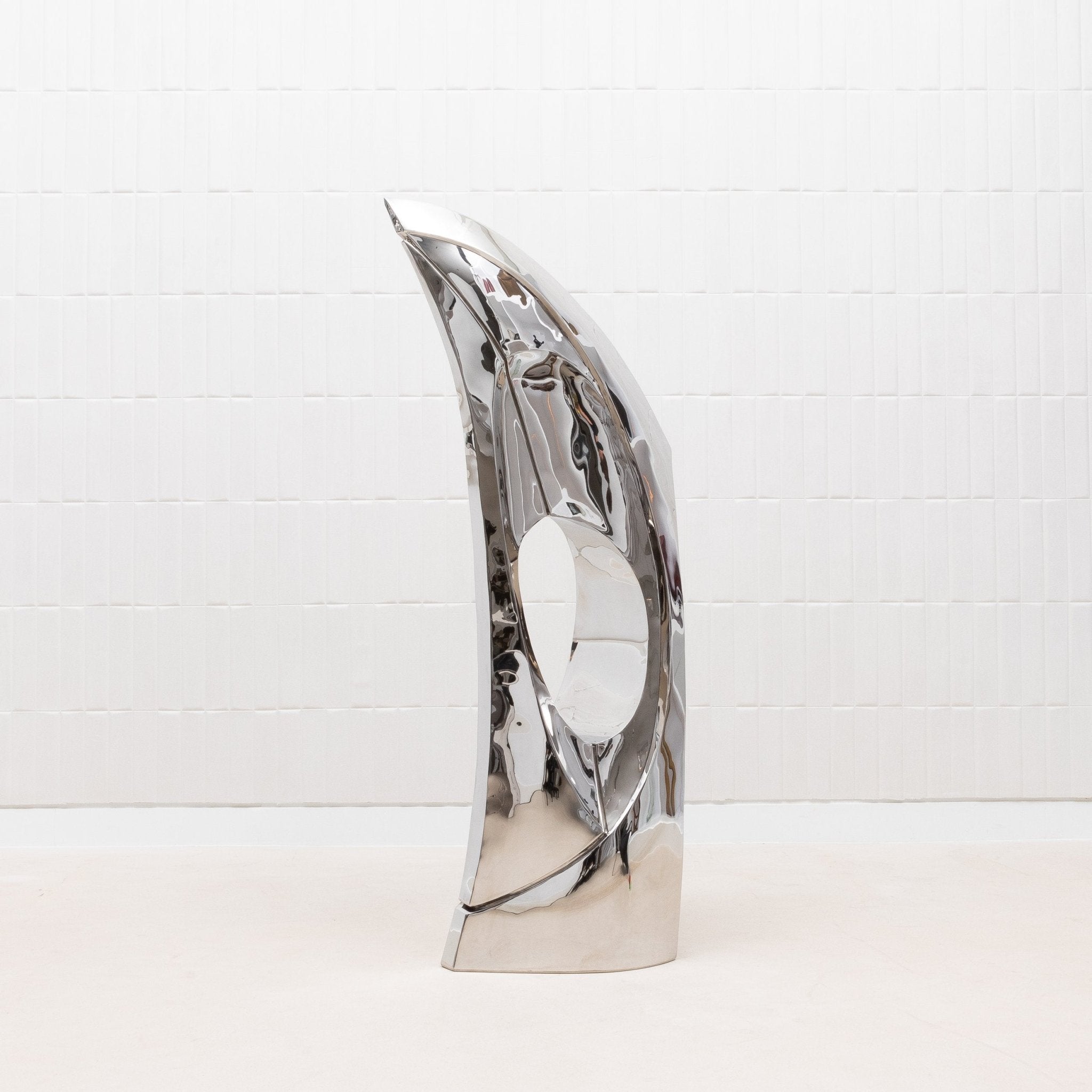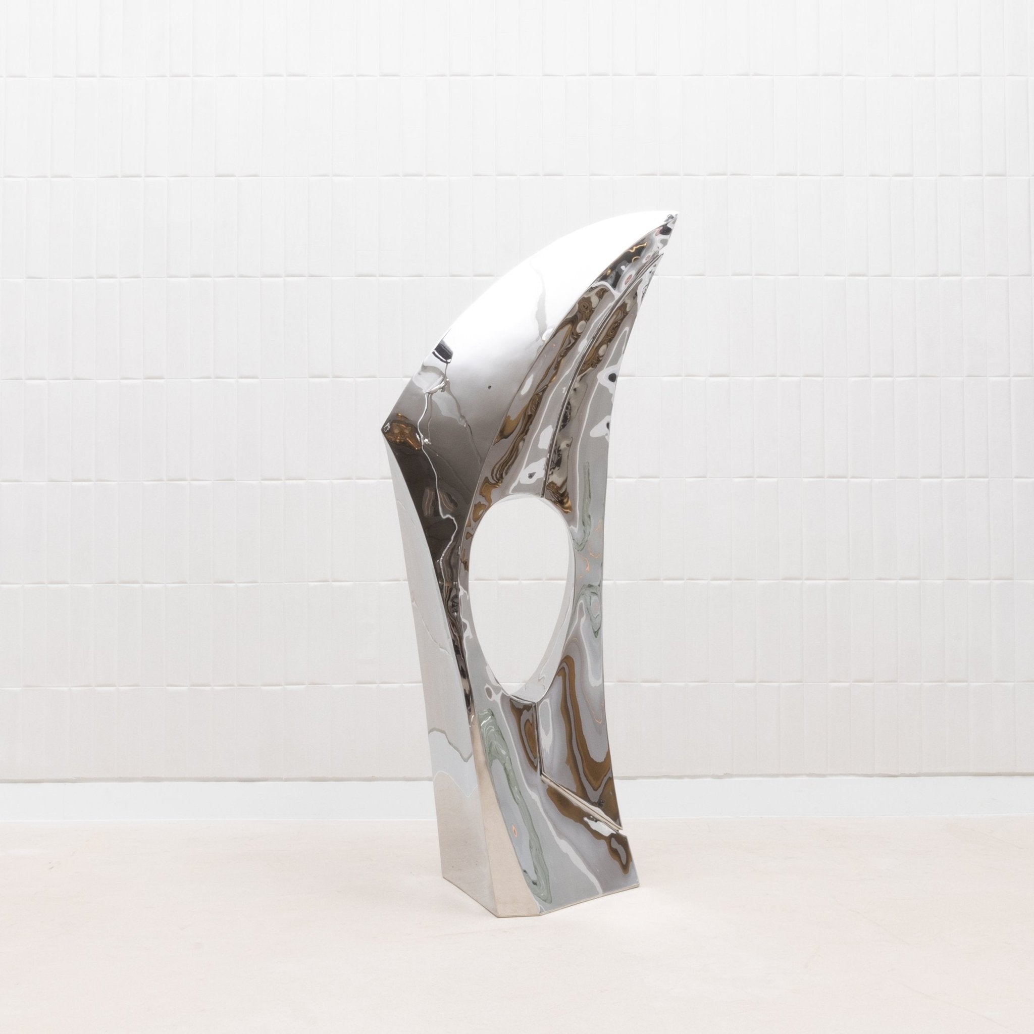 The "GOLDEN RATIO" sculpture by Patrick Coard Paris is a striking embodiment of modern elegance, meticulously crafted from a polished stainless steel veneer inlaid on a fiberglass core. Its nearly 65-inch tall form features fluid, sweeping curves that reflect the timeless beauty of the golden ratio, creating a piece that resonates with harmony and balance. The highly reflective surface of the polished stainless steel adds a dynamic, almost ethereal quality, capturing and transforming light in a mesmerizing dance. This exquisite finish, while challenging to photograph, only enhances the sculpture's allure, making it a true statement piece for those who appreciate the intersection of luxury, art, and mathematical perfection.