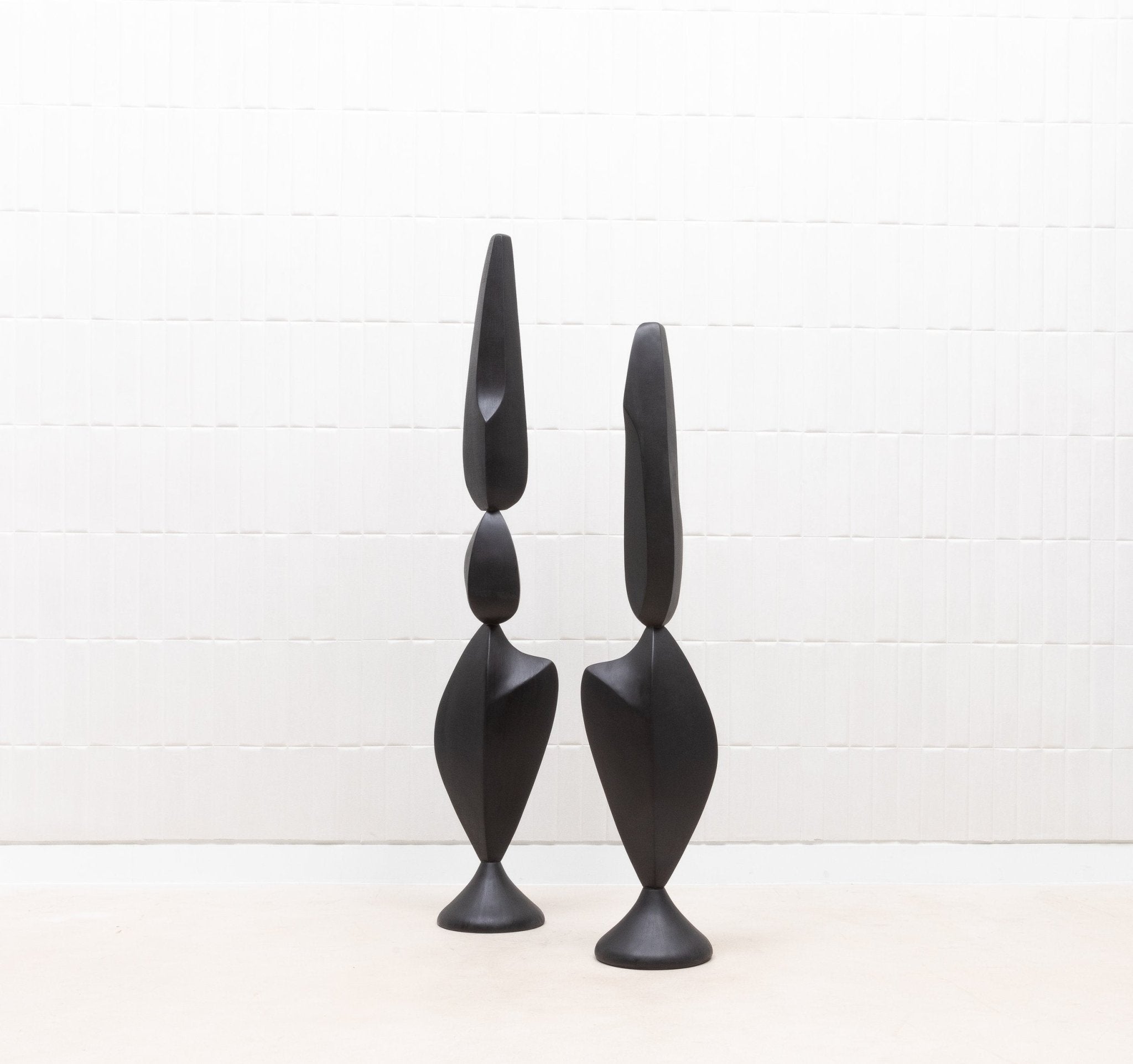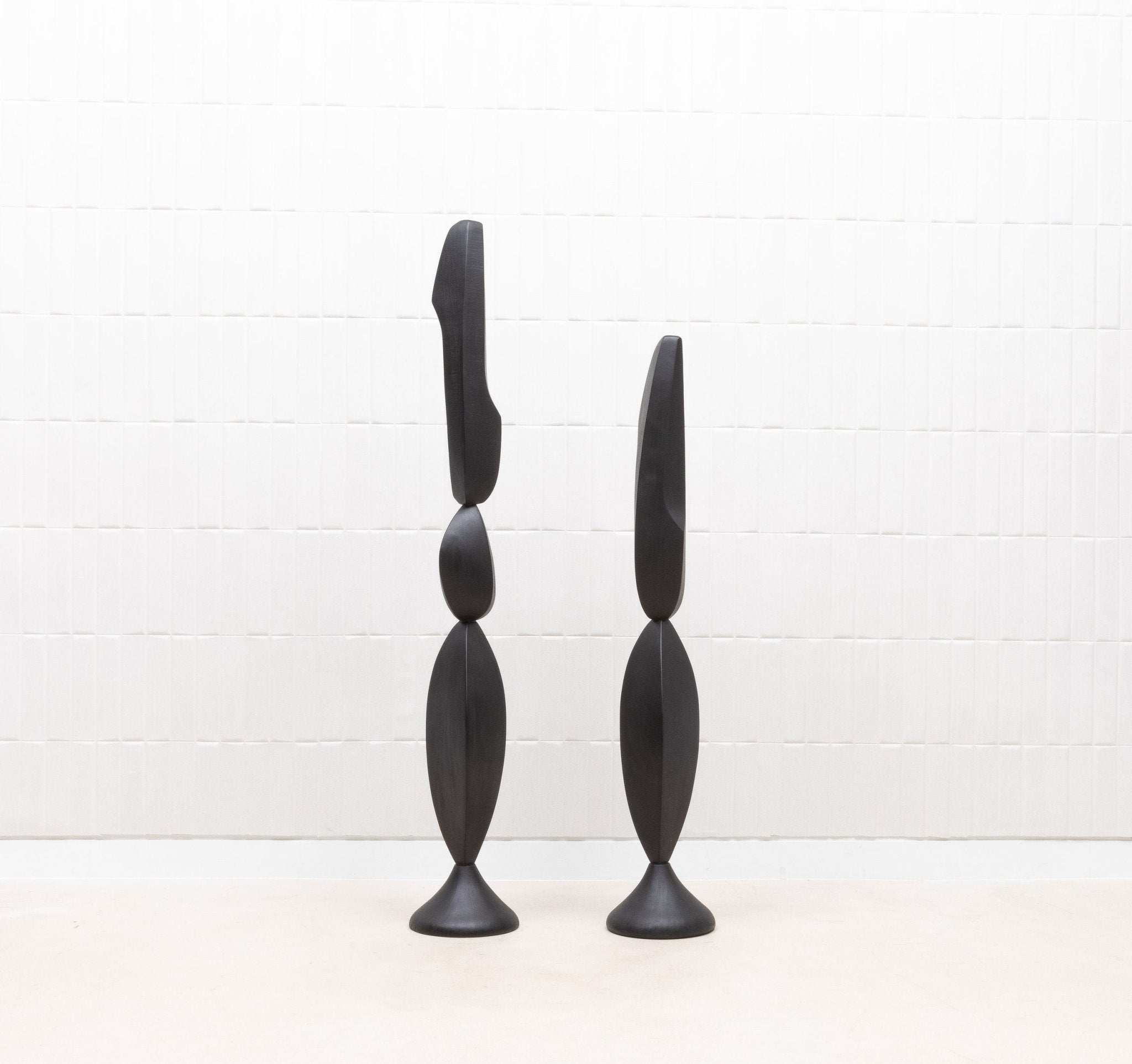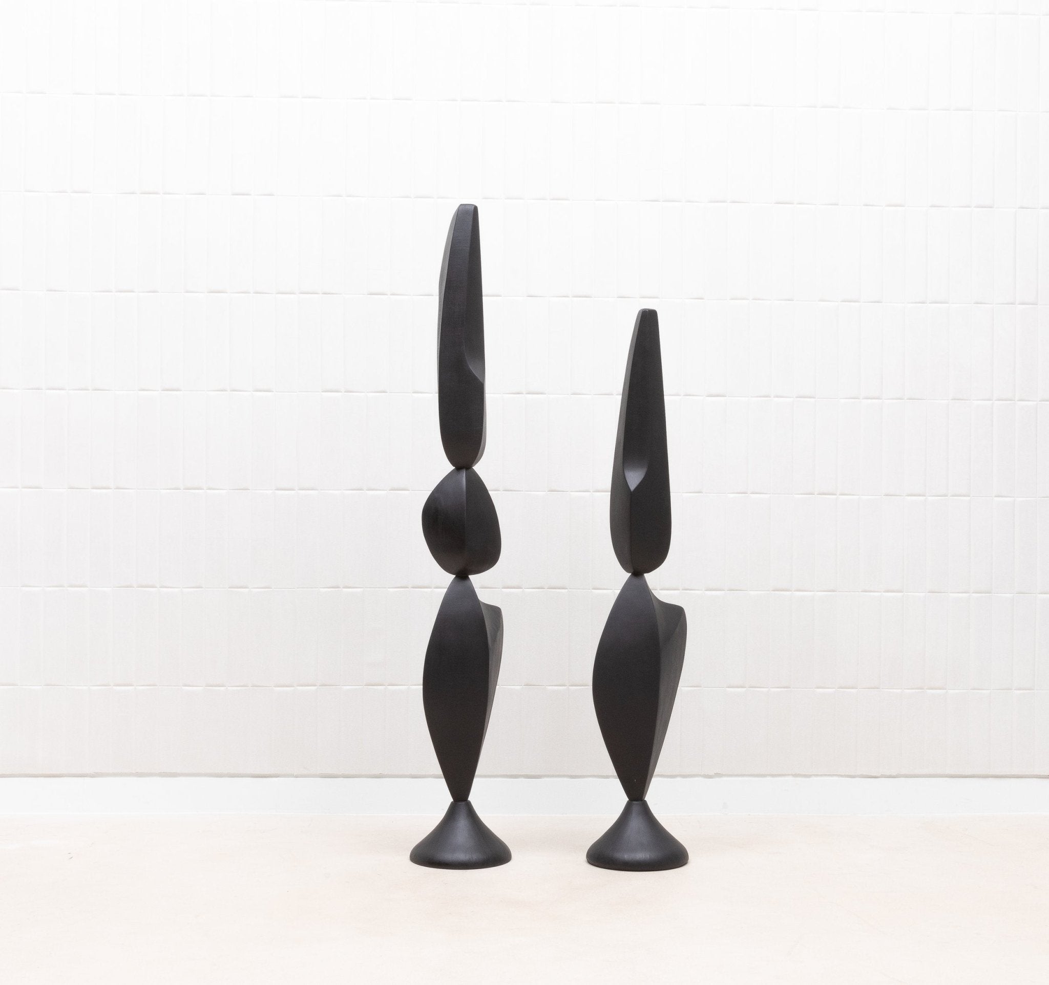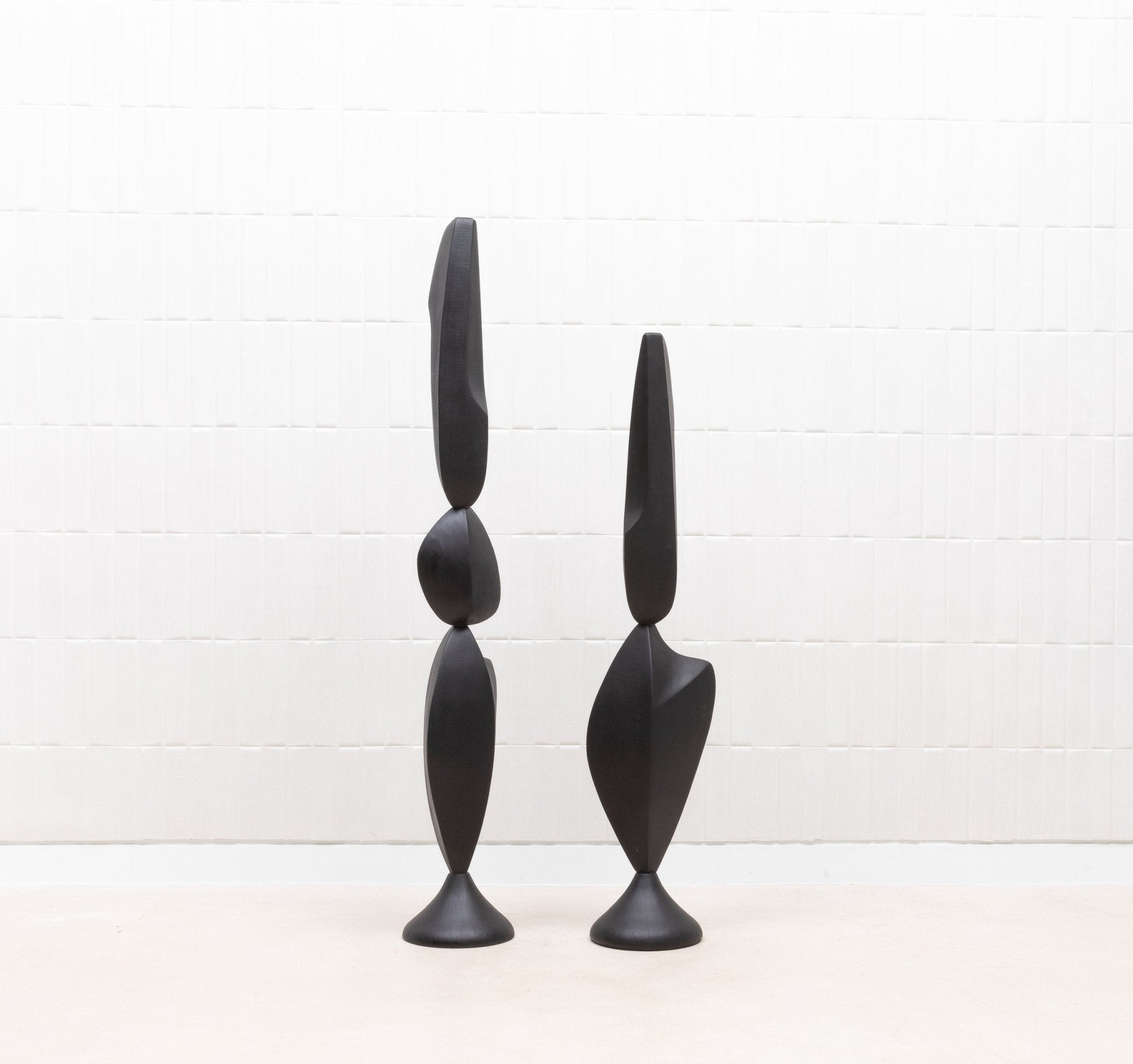 The "MOON & SKY" sculptures by Patrick Coard Paris are a stunning pair of modern abstract art pieces, masterfully crafted from a rich black oak veneer inlaid on a fiberglass core. Standing at 66.92 inches and 55.51 inches tall respectively, these hand-crafted sculptures embody the tranquil beauty of their namesakes, with graceful, flowing forms that evoke the serene connection between the moon and the sky. The deep, natural tones of the black oak lend a sophisticated warmth to the pieces, enhancing their organic elegance. These sculptures are not just decorative objects; they are refined statements of luxury and artistry, perfect for those who appreciate the timeless allure of finely crafted wood in their interior spaces.