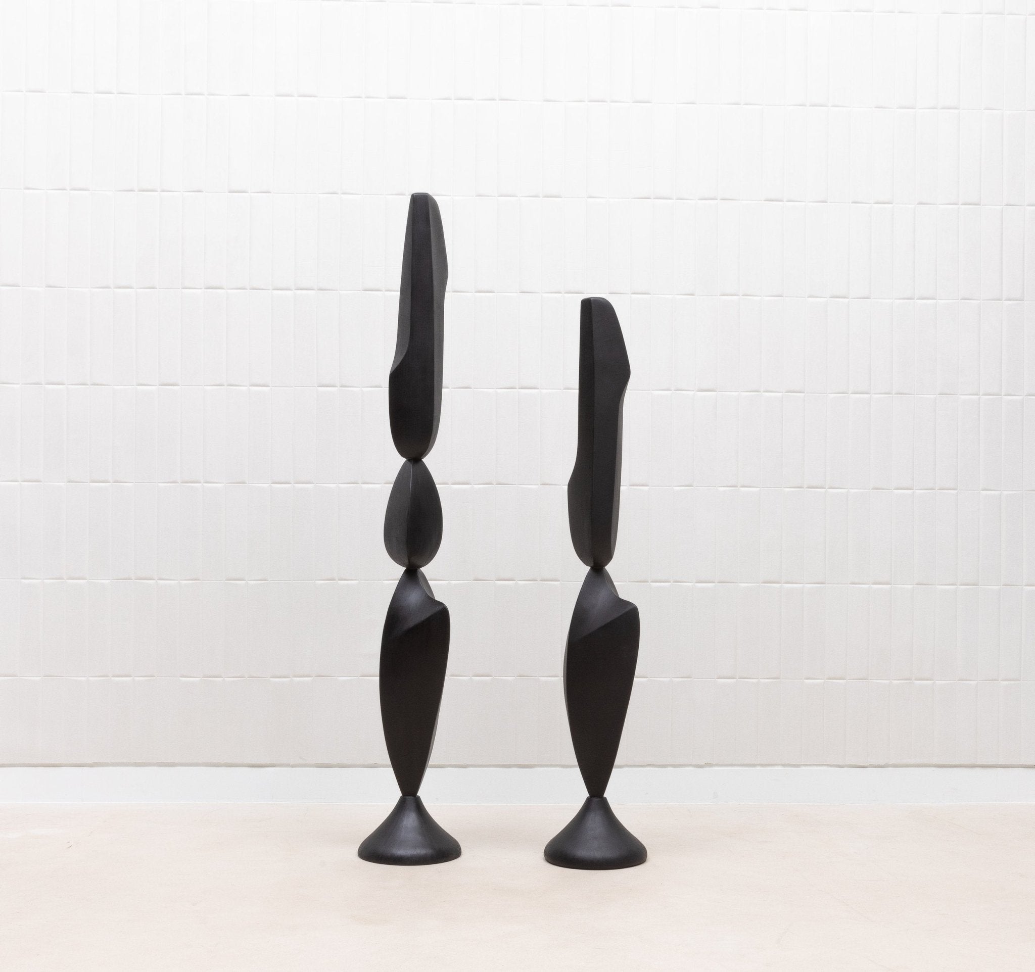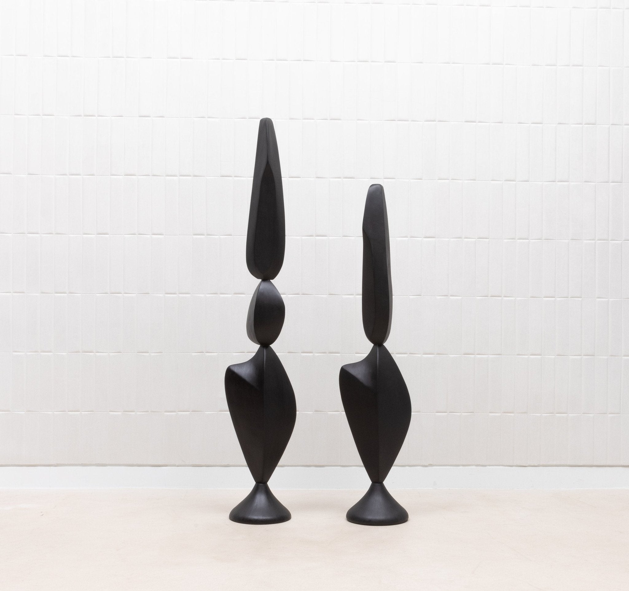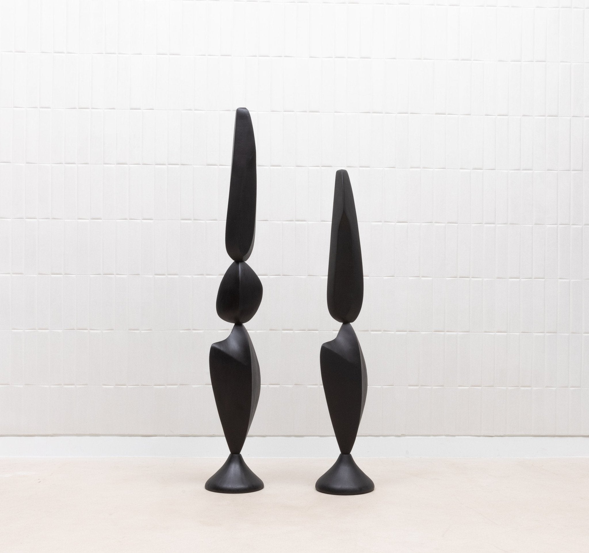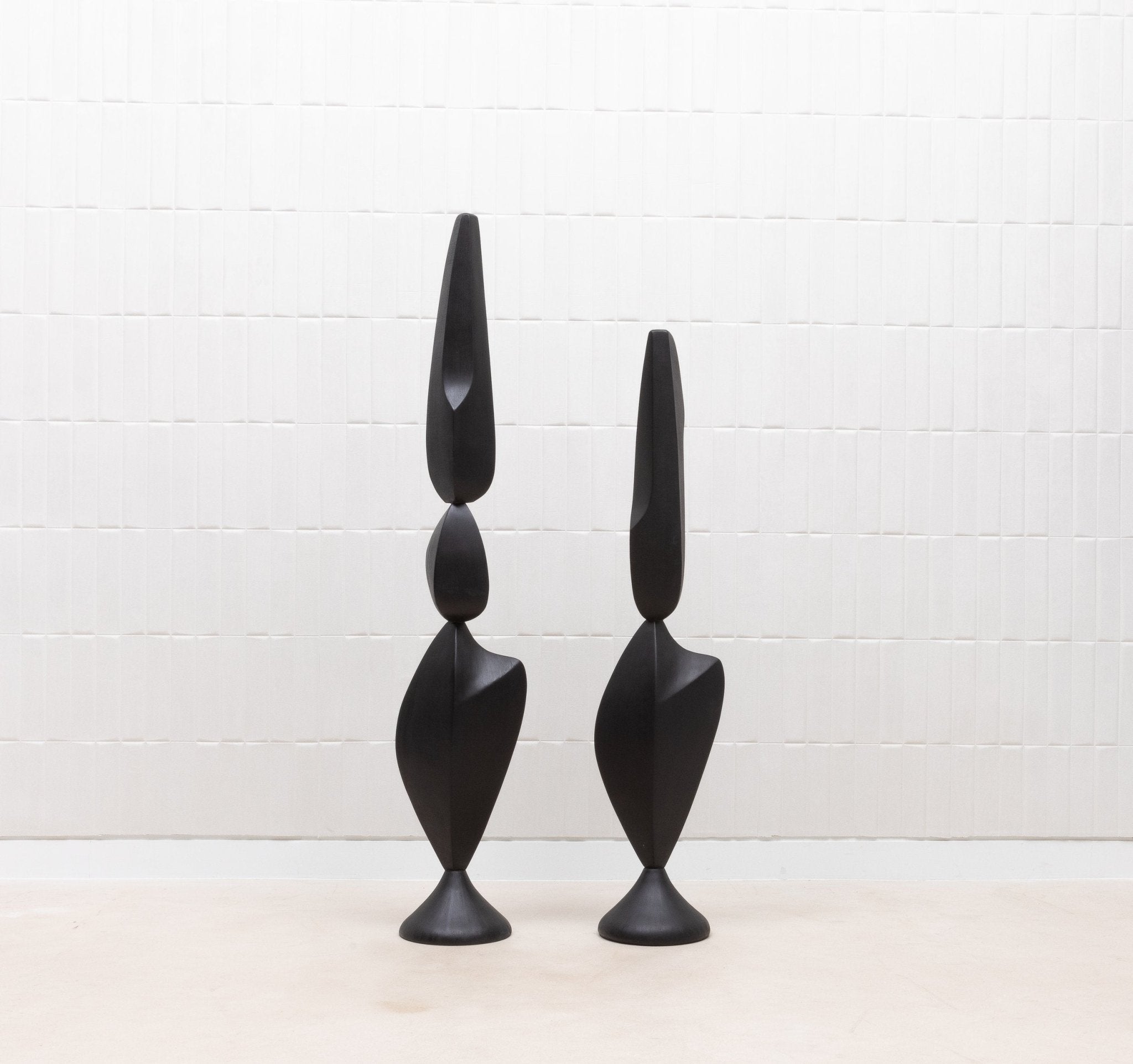 The "MOON & SKY" sculptures by Patrick Coard Paris are a stunning pair of modern abstract art pieces, masterfully crafted from a rich black oak veneer inlaid on a fiberglass core. Standing at 66.92 inches and 55.51 inches tall respectively, these hand-crafted sculptures embody the tranquil beauty of their namesakes, with graceful, flowing forms that evoke the serene connection between the moon and the sky. The deep, natural tones of the black oak lend a sophisticated warmth to the pieces, enhancing their organic elegance. These sculptures are not just decorative objects; they are refined statements of luxury and artistry, perfect for those who appreciate the timeless allure of finely crafted wood in their interior spaces.