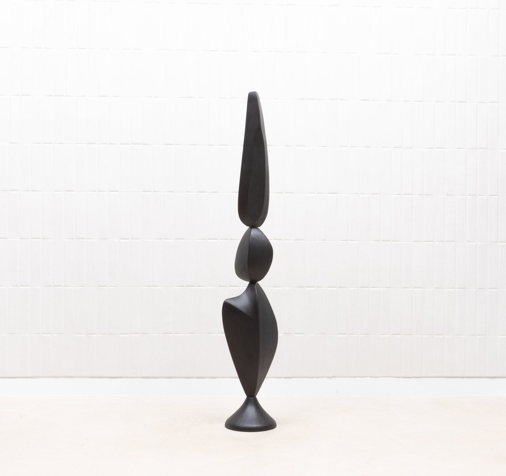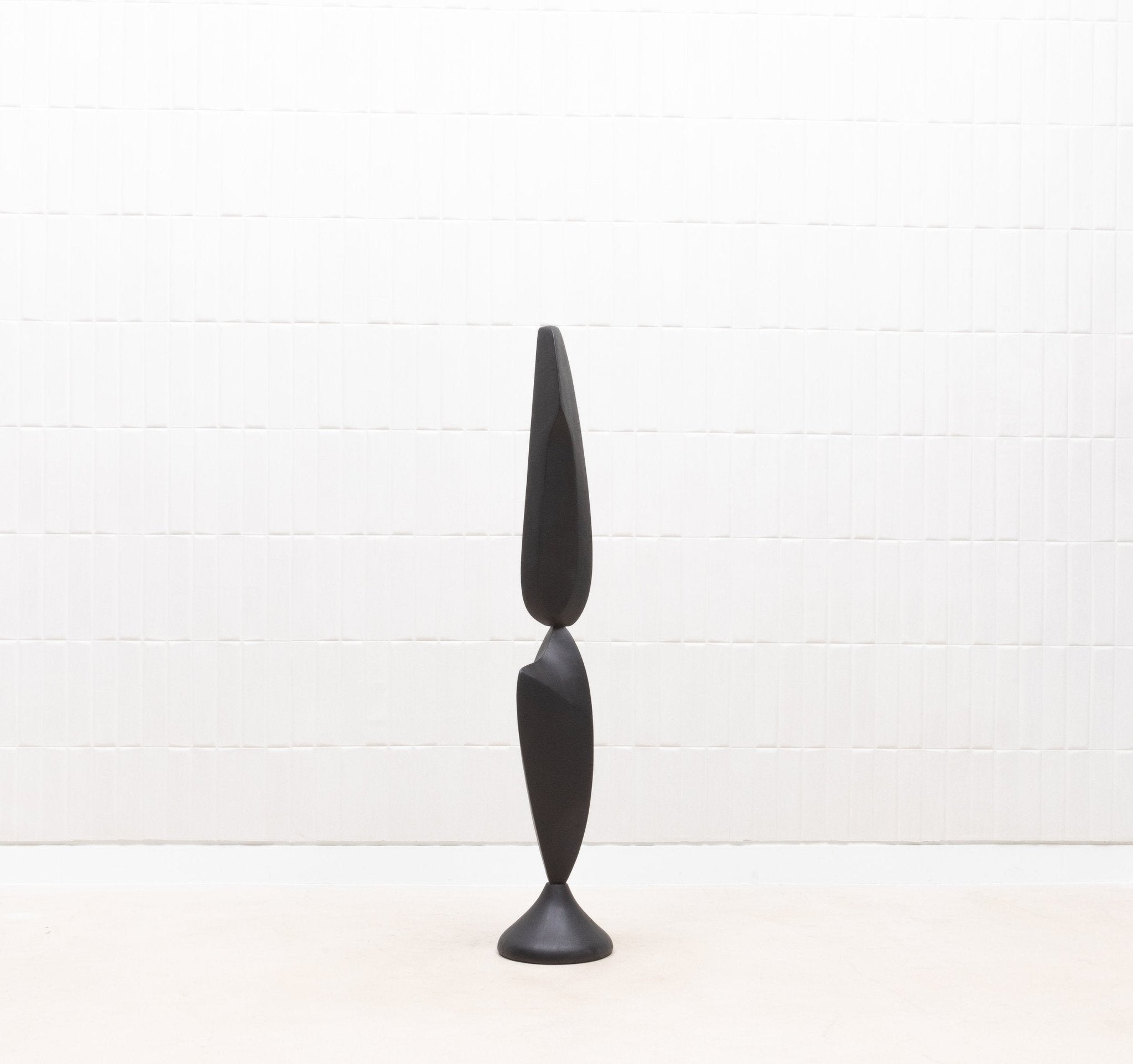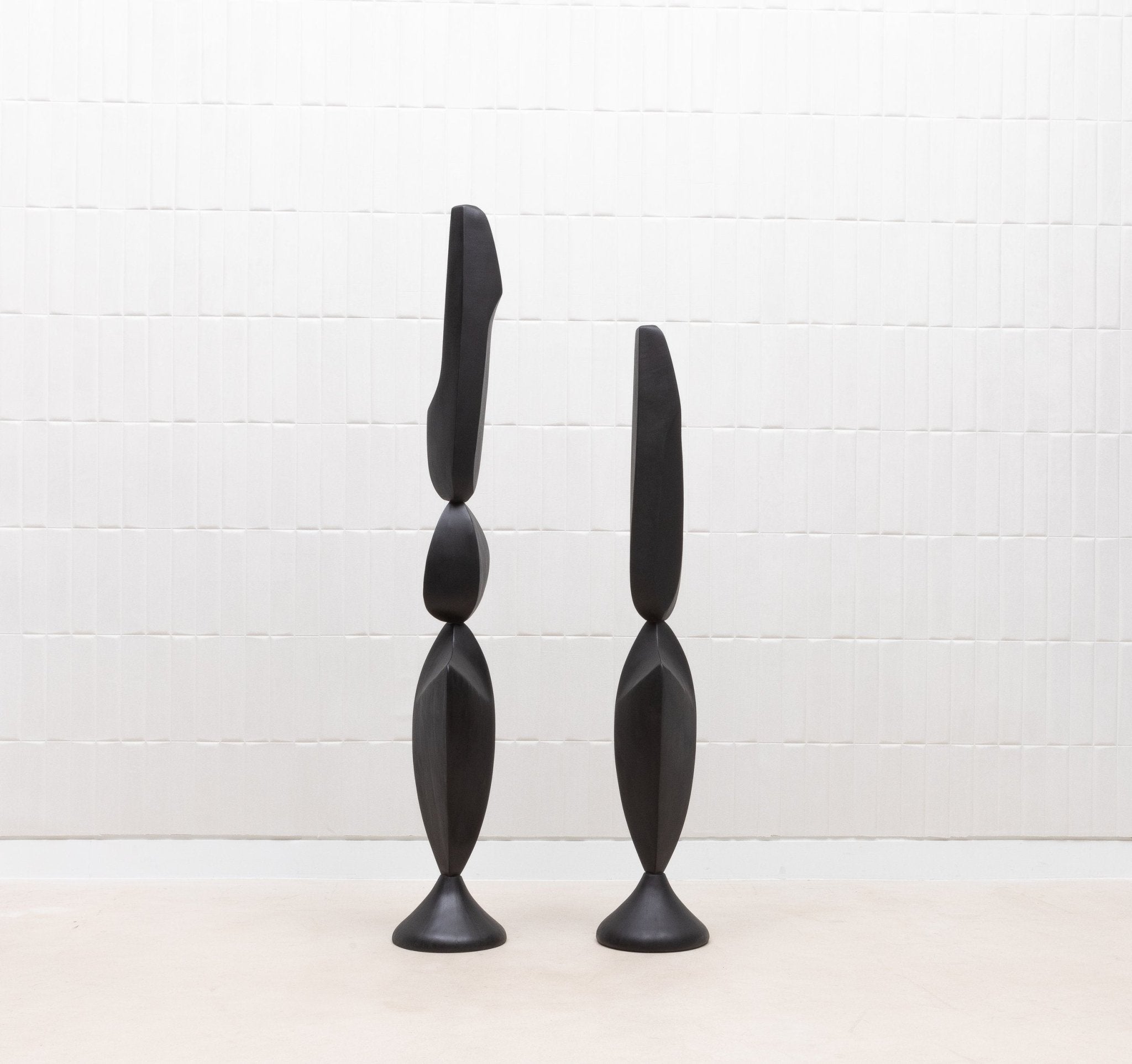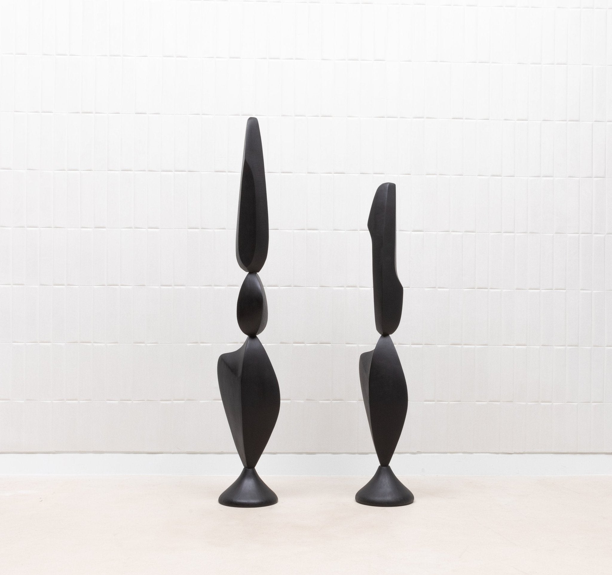 The "MOON & SKY" sculptures by Patrick Coard Paris are a stunning pair of modern abstract art pieces, masterfully crafted from a rich black oak veneer inlaid on a fiberglass core. Standing at 66.92 inches and 55.51 inches tall respectively, these hand-crafted sculptures embody the tranquil beauty of their namesakes, with graceful, flowing forms that evoke the serene connection between the moon and the sky. The deep, natural tones of the black oak lend a sophisticated warmth to the pieces, enhancing their organic elegance. These sculptures are not just decorative objects; they are refined statements of luxury and artistry, perfect for those who appreciate the timeless allure of finely crafted wood in their interior spaces.