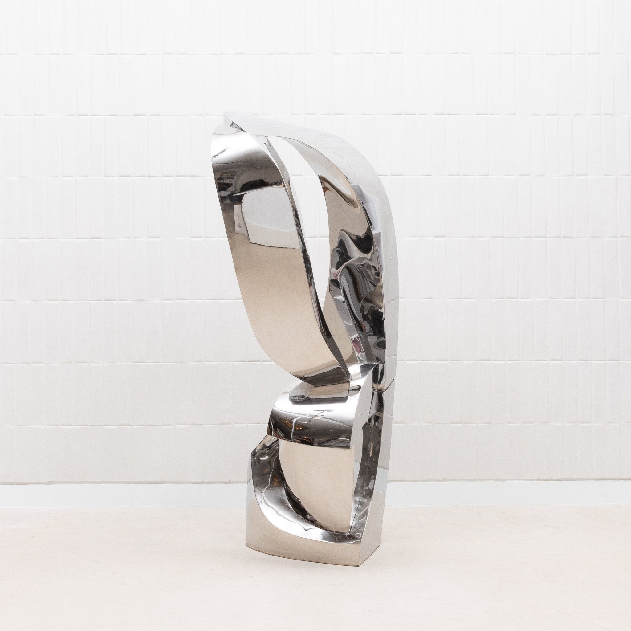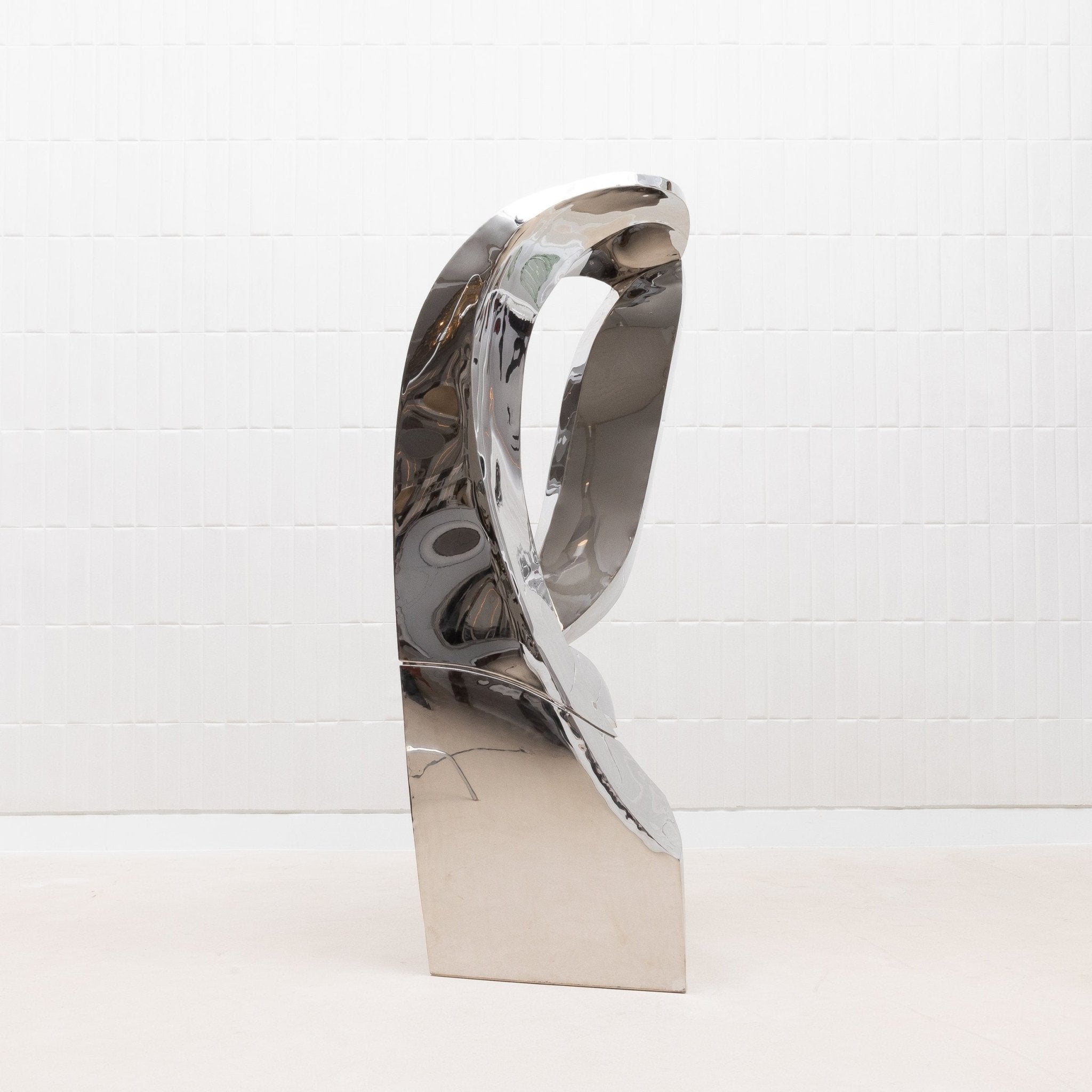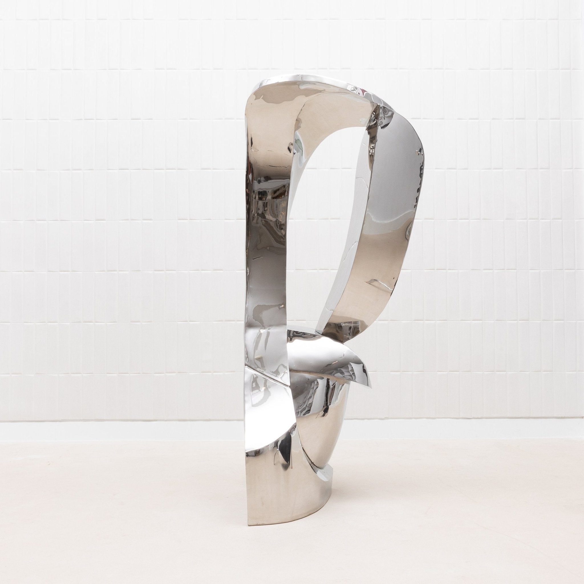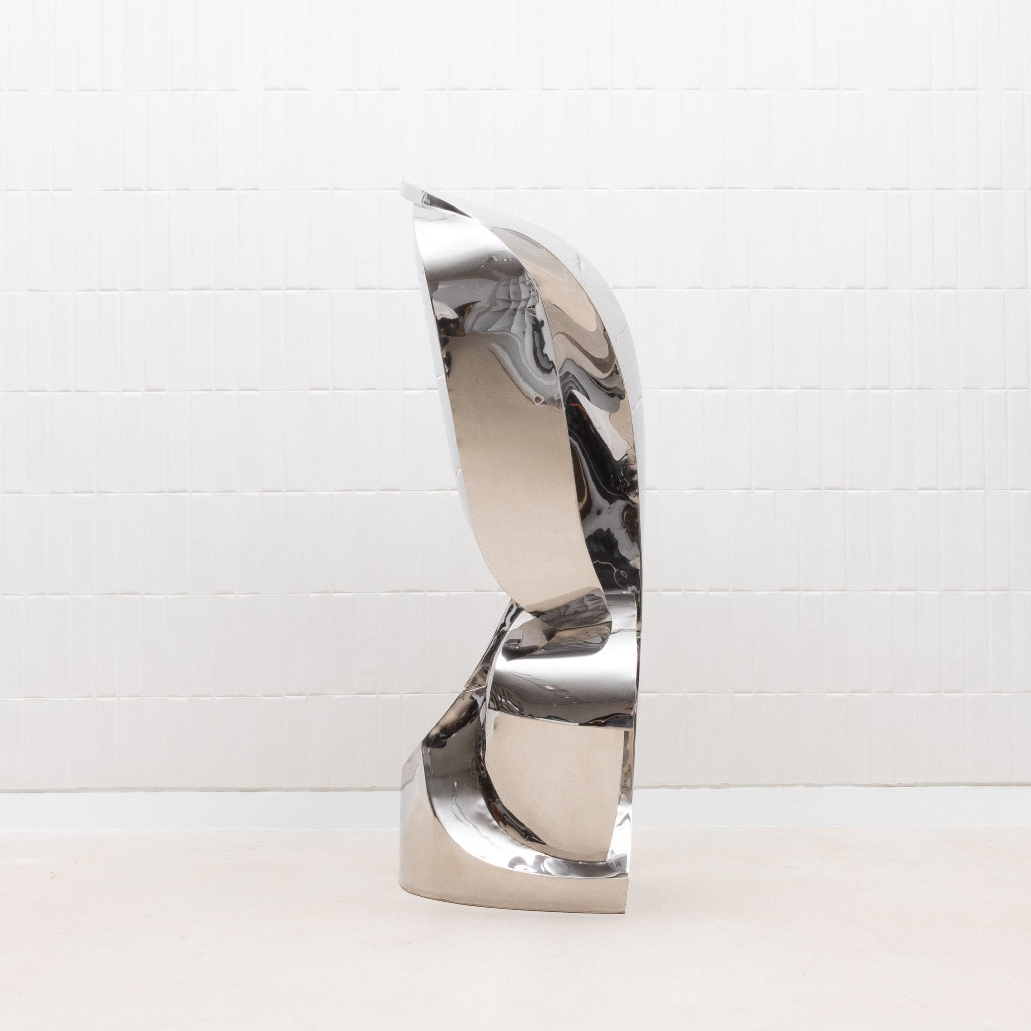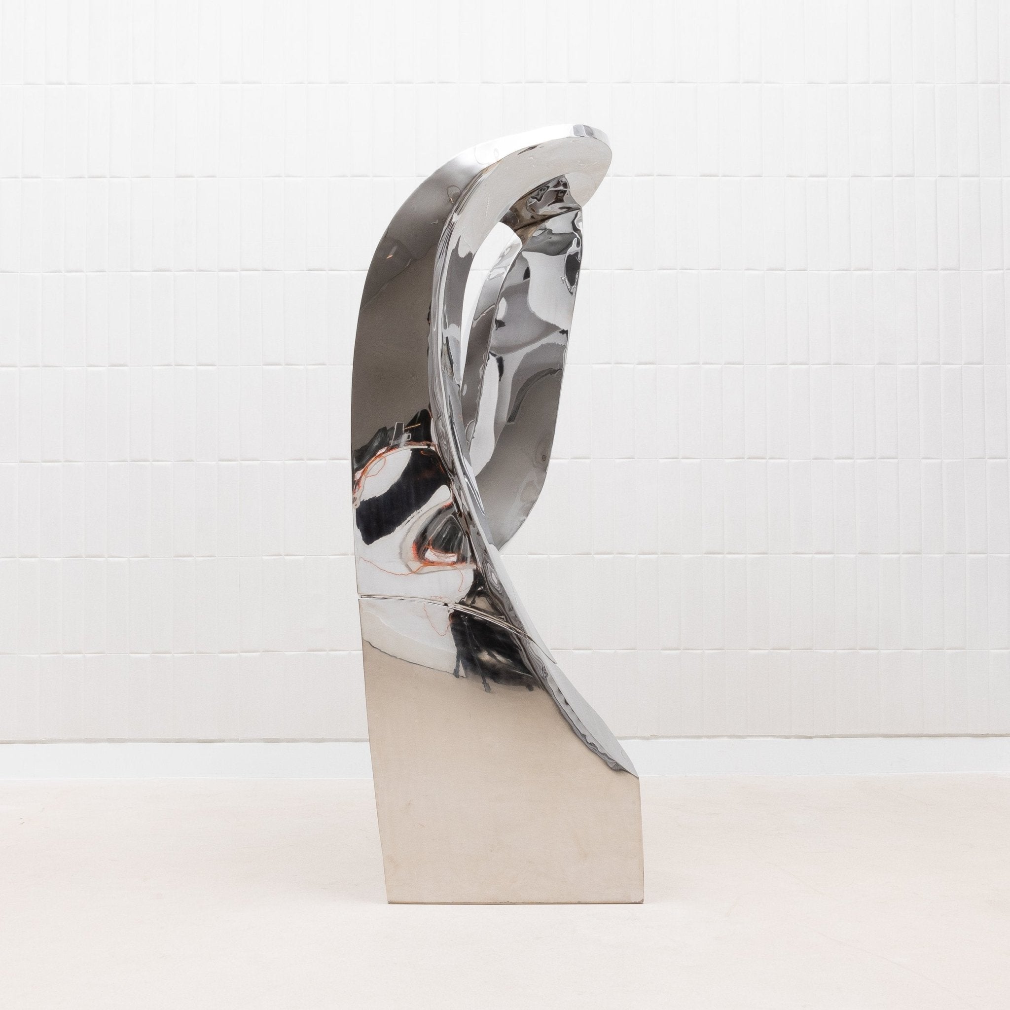 The "WAVE" sculpture by Patrick Coard Paris is a striking example of modern artistry, crafted from a polished stainless steel veneer inlaid on a fiberglass core that reflects light with mesmerizing brilliance. Standing nearly 65 inches tall, its fluid, abstract form evokes the graceful motion of ocean waves, adding a dynamic yet serene presence to any space. This hand-crafted piece is a true statement of luxury, blending contemporary elegance with the timeless allure of finely wrought metalwork, making it a captivating centerpiece for sophisticated interiors.