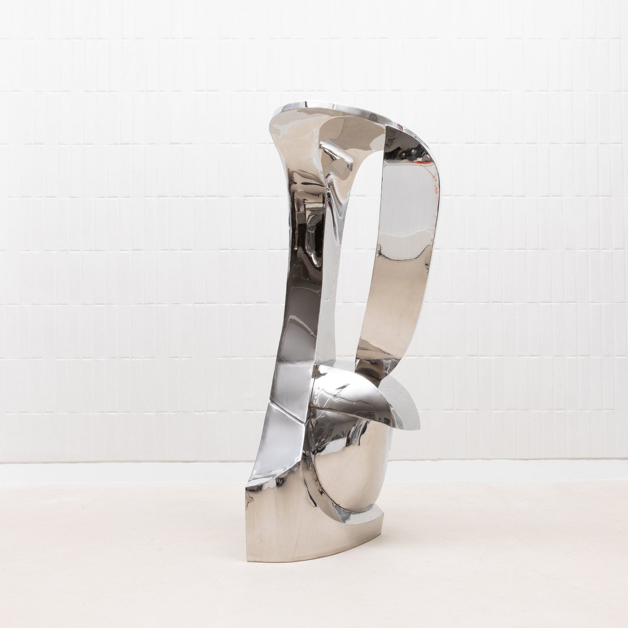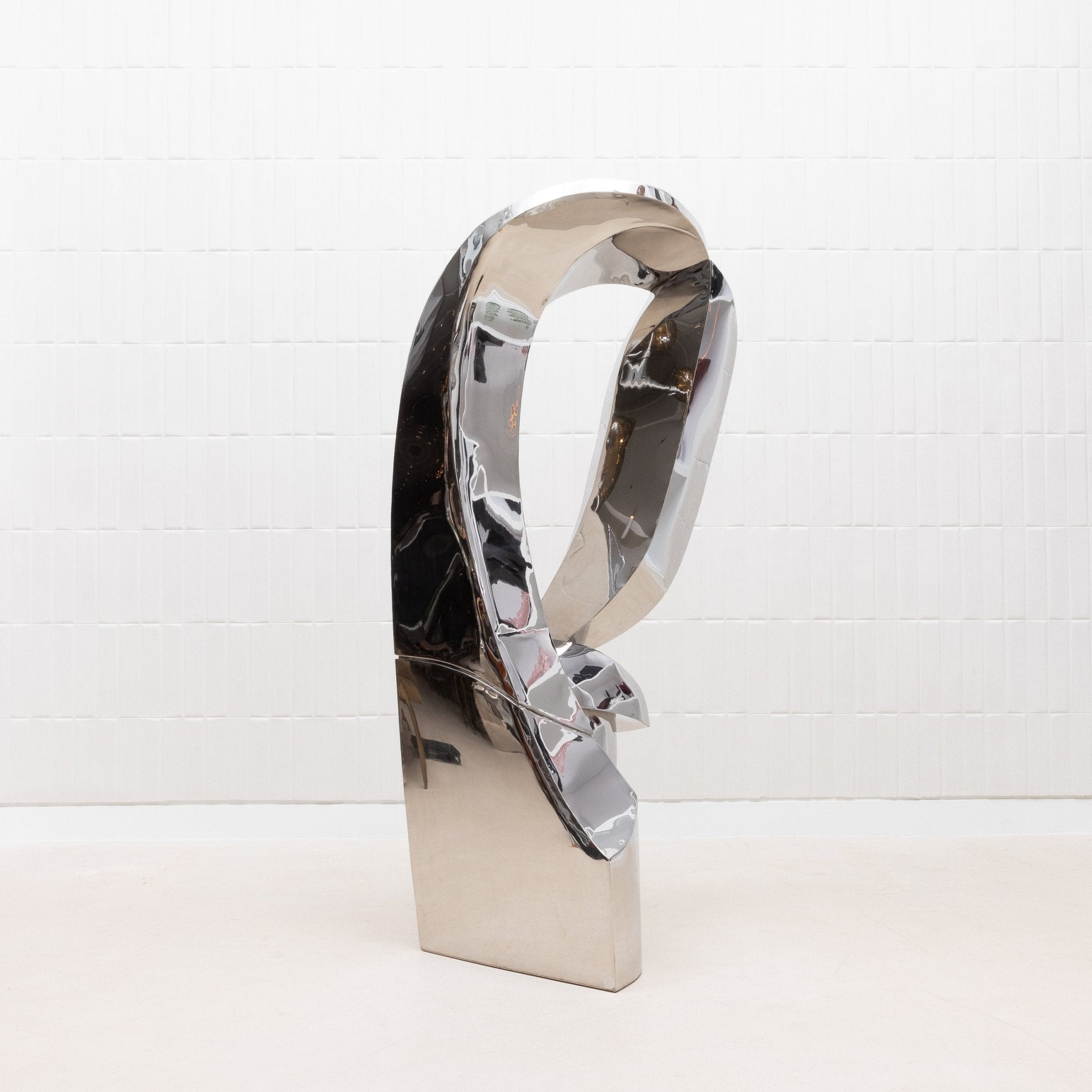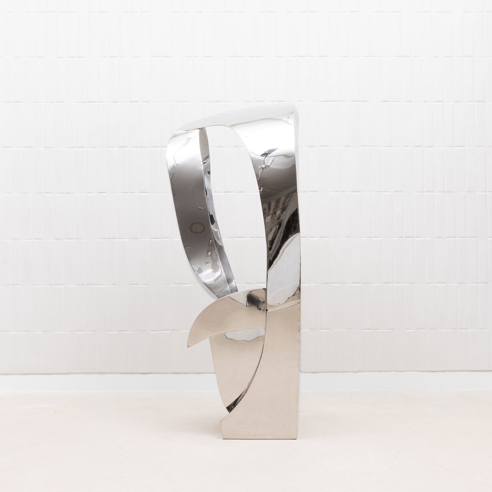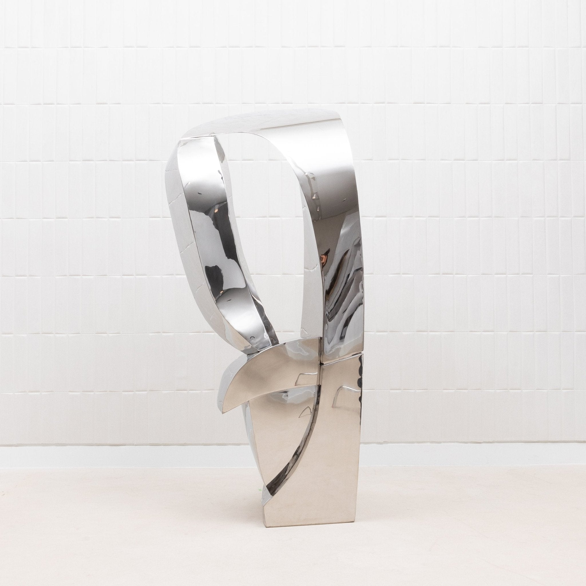 The "WAVE" sculpture by Patrick Coard Paris is a striking example of modern artistry, crafted from a polished stainless steel veneer inlaid on a fiberglass core that reflects light with mesmerizing brilliance. Standing nearly 65 inches tall, its fluid, abstract form evokes the graceful motion of ocean waves, adding a dynamic yet serene presence to any space. This hand-crafted piece is a true statement of luxury, blending contemporary elegance with the timeless allure of finely wrought metalwork, making it a captivating centerpiece for sophisticated interiors.