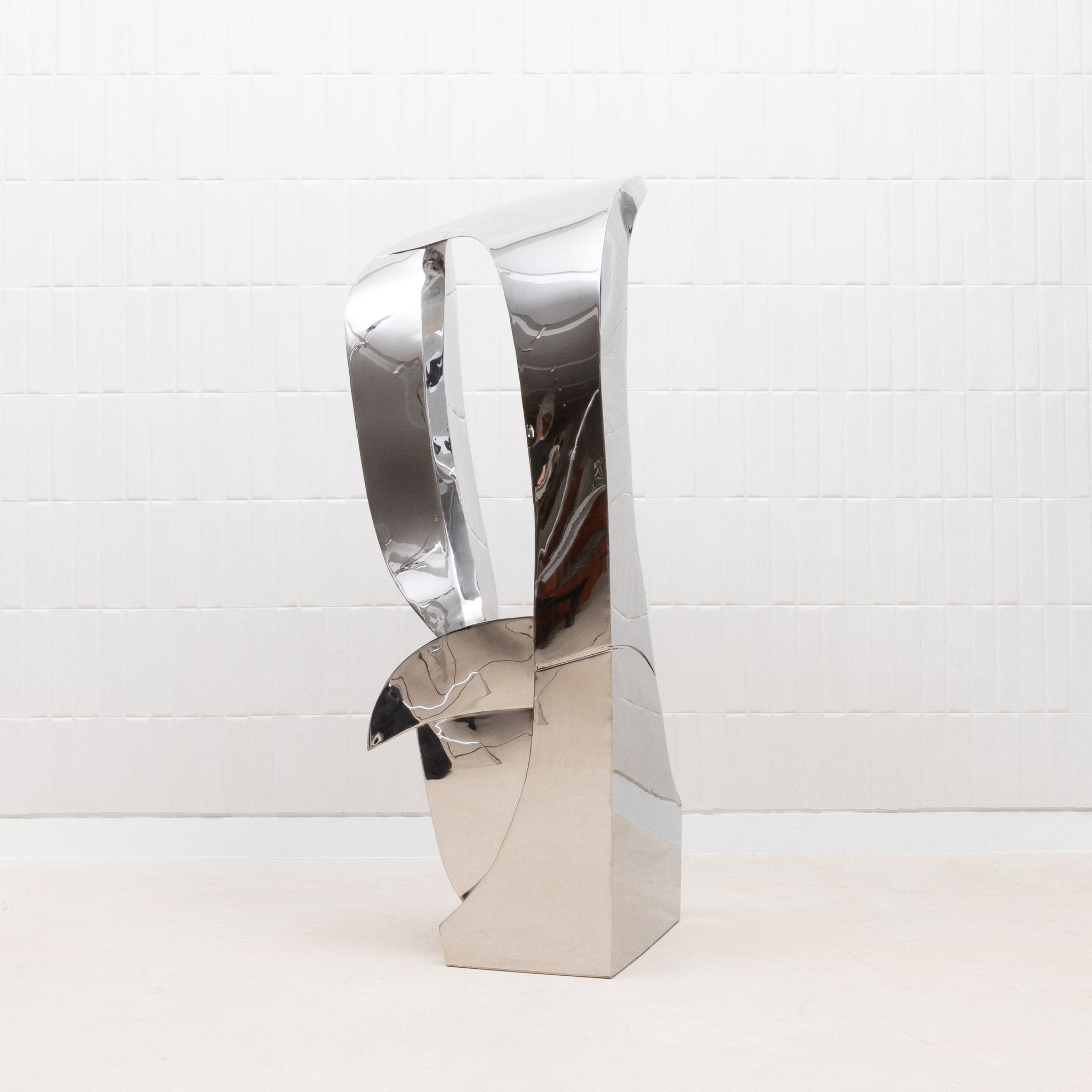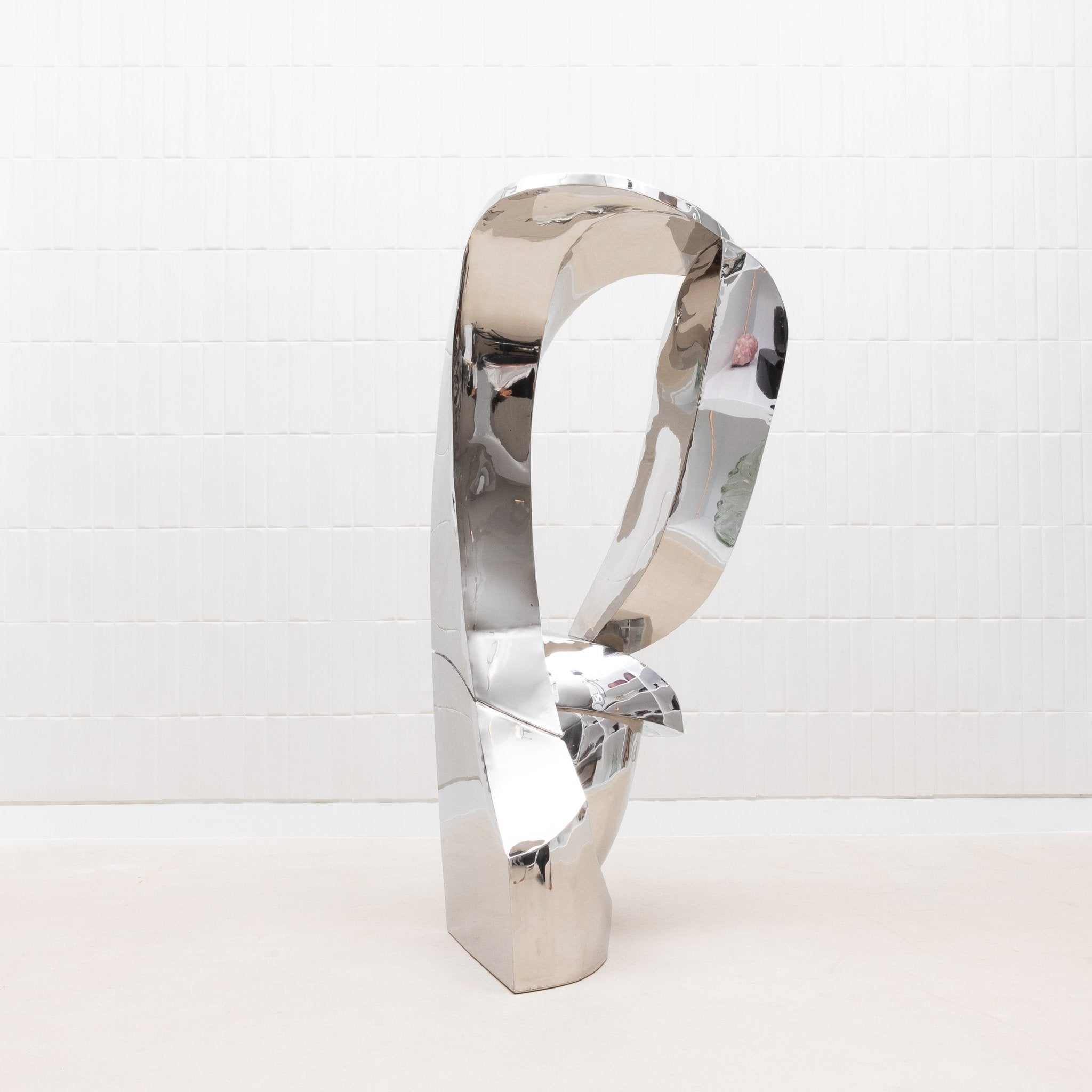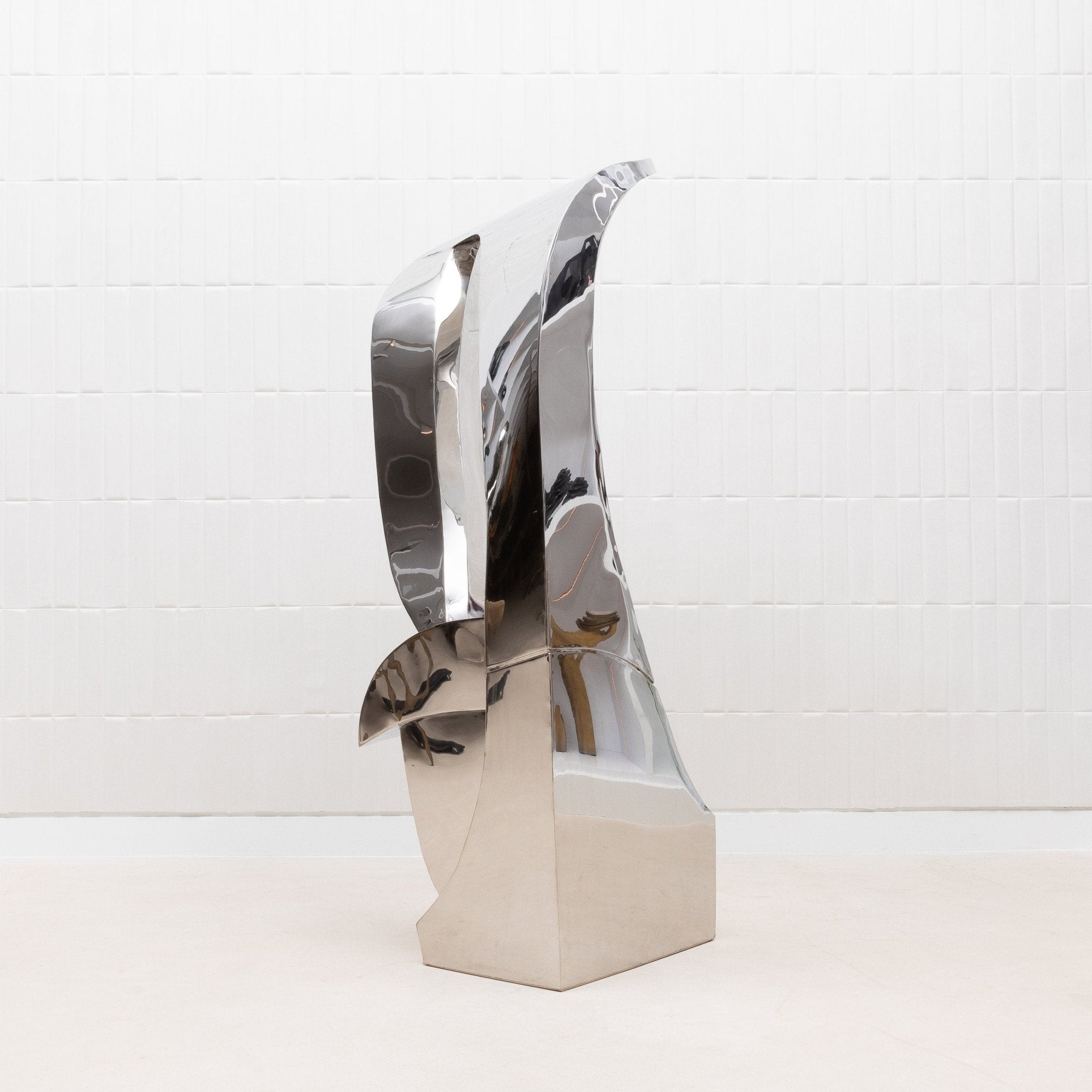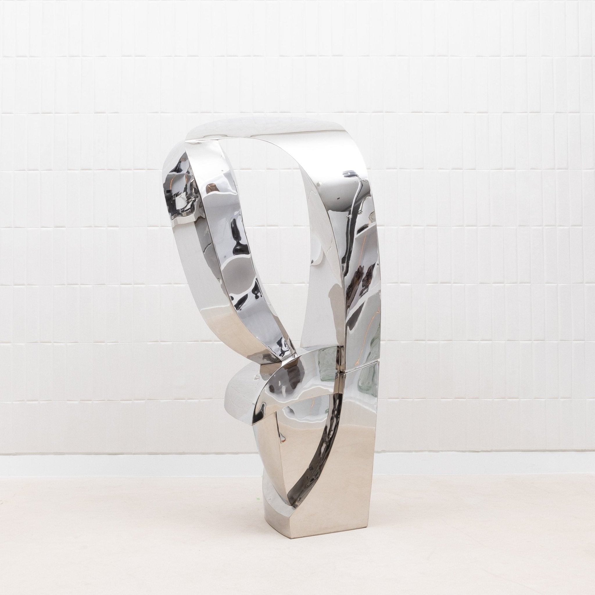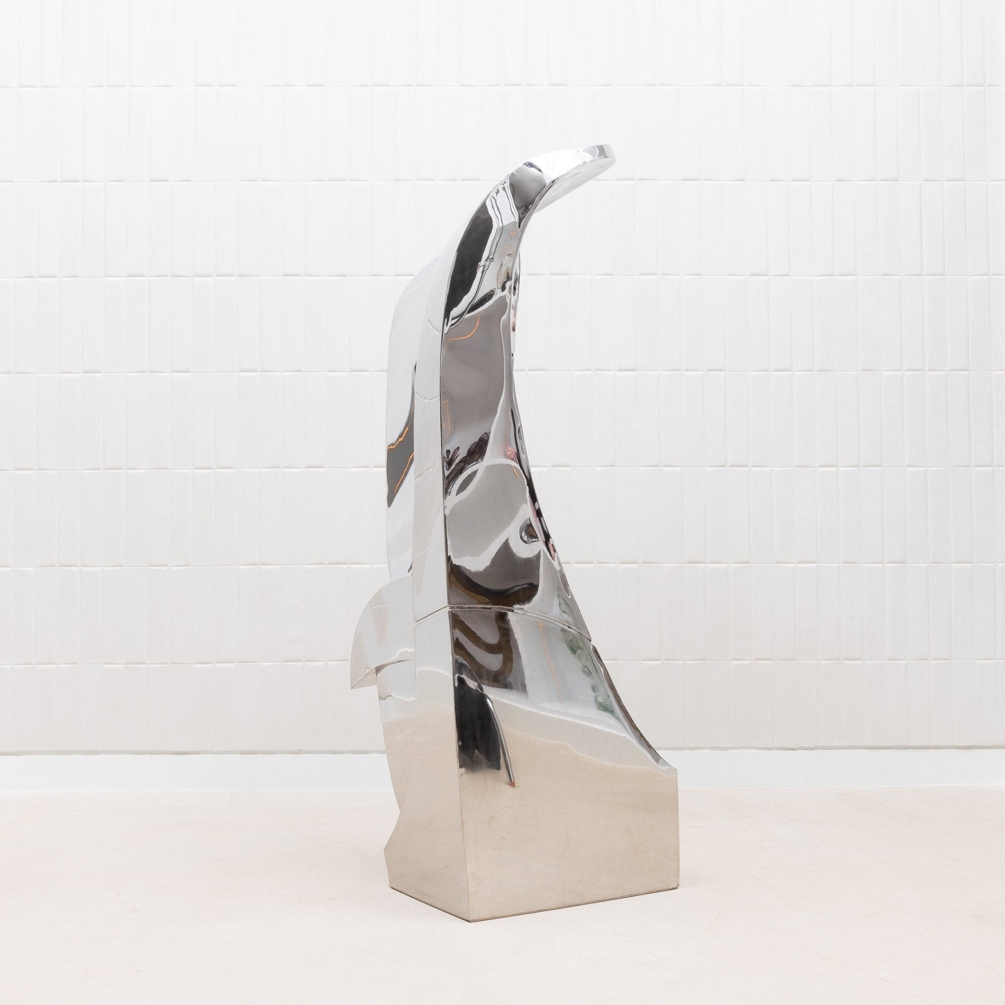The "WAVE" sculpture by Patrick Coard Paris is a striking example of modern artistry, crafted from a polished stainless steel veneer inlaid on a fiberglass core that reflects light with mesmerizing brilliance. Standing nearly 65 inches tall, its fluid, abstract form evokes the graceful motion of ocean waves, adding a dynamic yet serene presence to any space. This hand-crafted piece is a true statement of luxury, blending contemporary elegance with the timeless allure of finely wrought metalwork, making it a captivating centerpiece for sophisticated interiors.
