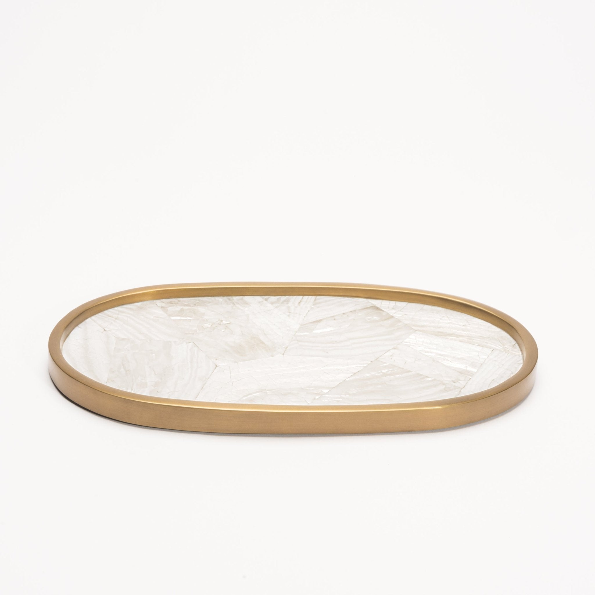 The interplay between the softly shimmering shell surface and the smooth metallic edge creates a sophisticated contrast that feels both timeless and contemporary. Its elongated form lends itself beautifully to styling on a cocktail table, console, vanity, or desk — offering a curated foundation for objects while remaining a statement in its own right.