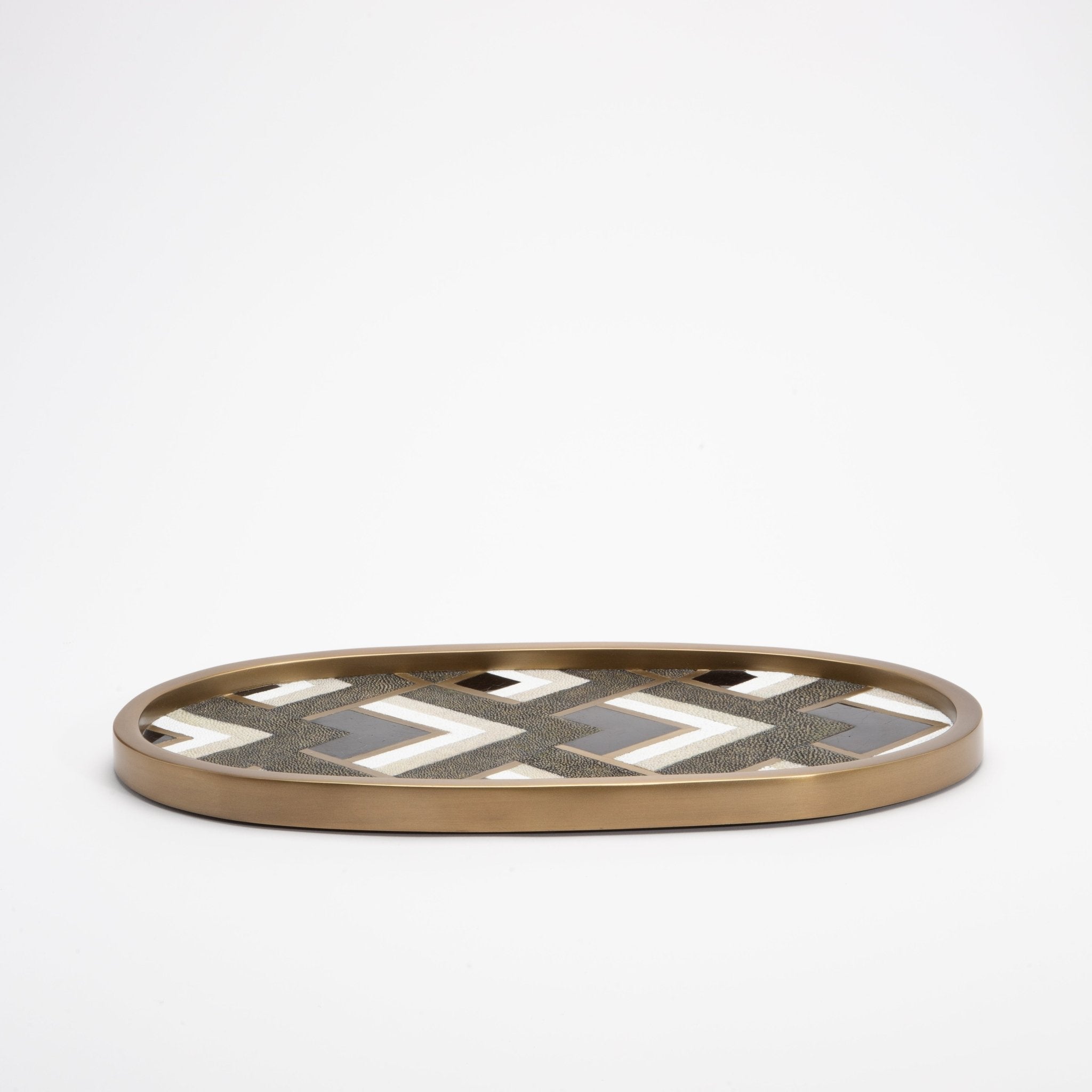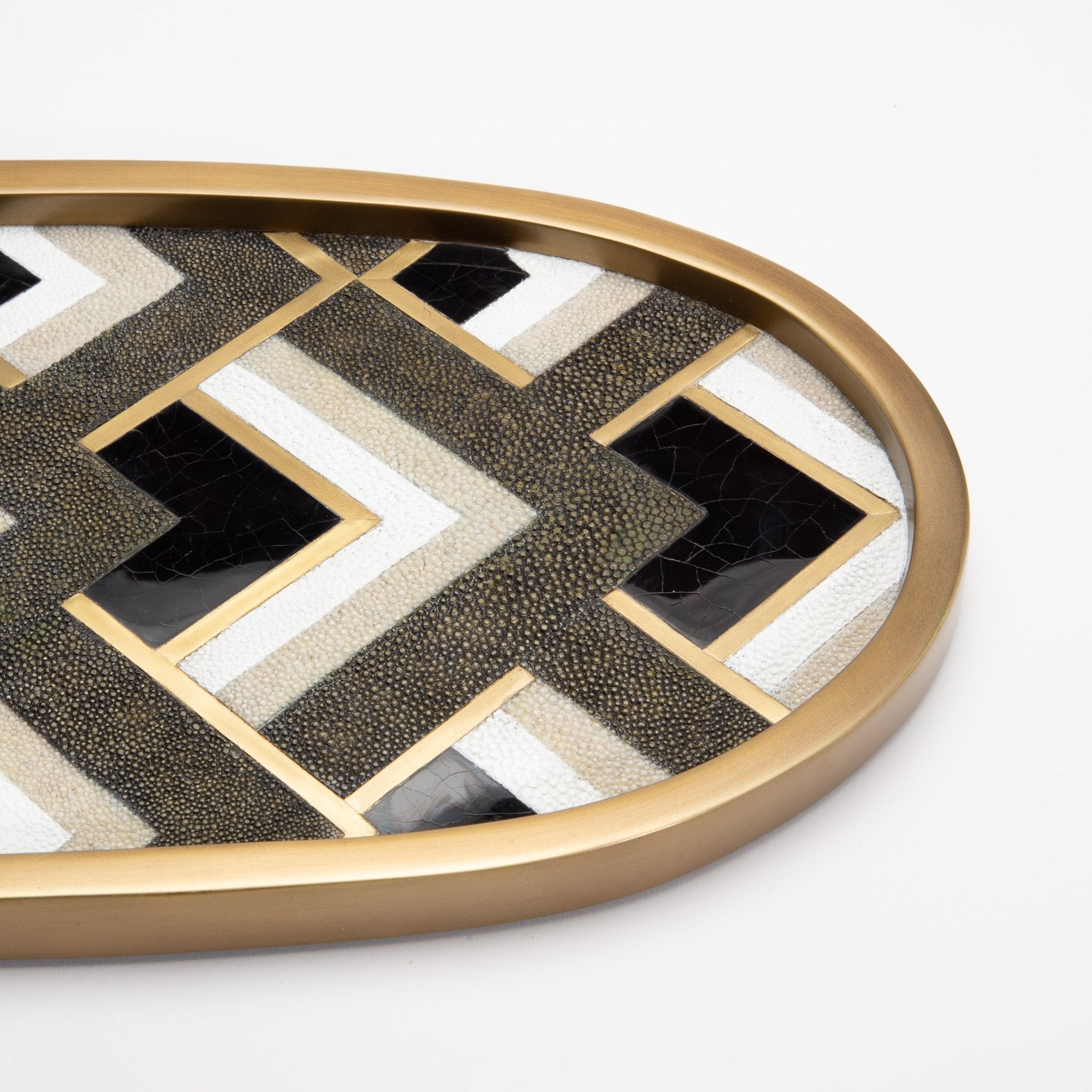 The Oval Tray in Triangle Pattern by Kifu Paris has a bold, graphic elegance that feels both architectural and refined. Its elongated oval form softens the sharp geometry within, creating a striking balance between fluid silhouette and structured design.