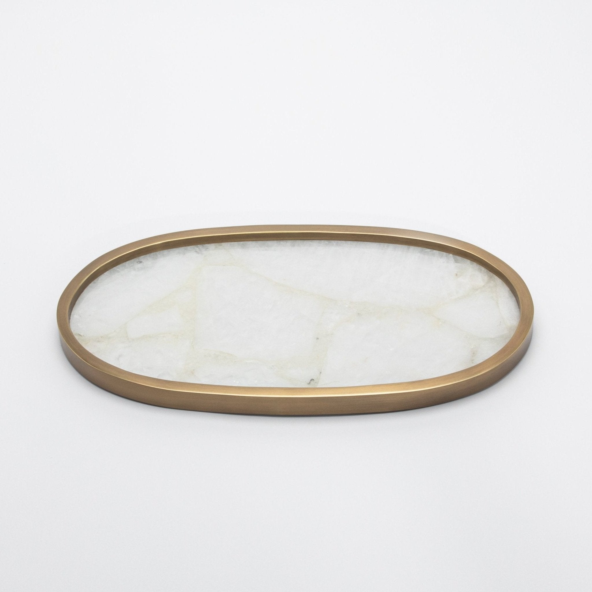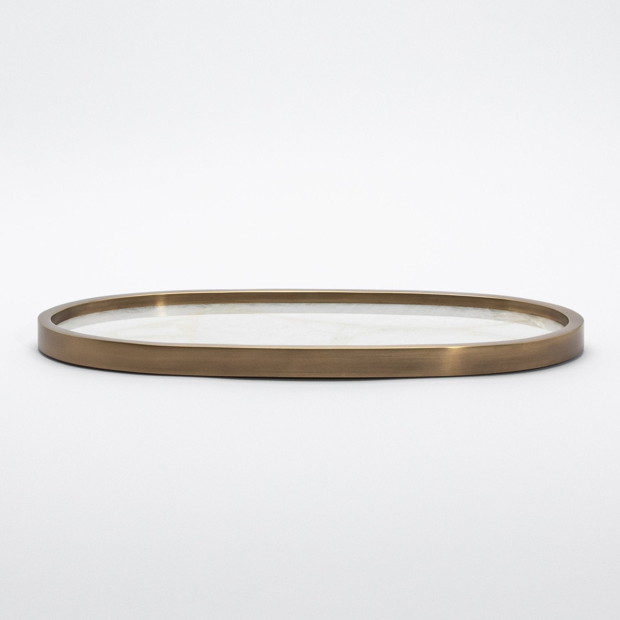 The Kifu Paris Oval Tray is a masterpiece of luxurious craftsmanship, merging natural elegance with refined artistry. The tray's surface is crafted from pristine white quartz, with intricate veining that captures the eye and reflects light in a soft, ethereal way, giving each piece a unique character. Encased in a smooth bronze patina brass frame, the oval silhouette enhances its understated sophistication. The combination of the delicate quartz and the warm, earthy tones of the bronze patina brass results in a balanced contrast, exuding a sense of both opulence and harmony. Each tray is meticulously handcrafted, ensuring a flawless finish that highlights the natural beauty of the materials. This exquisite tray is more than just a functional piece—it is a statement of timeless luxury, ideal for elevating any surface it graces.
