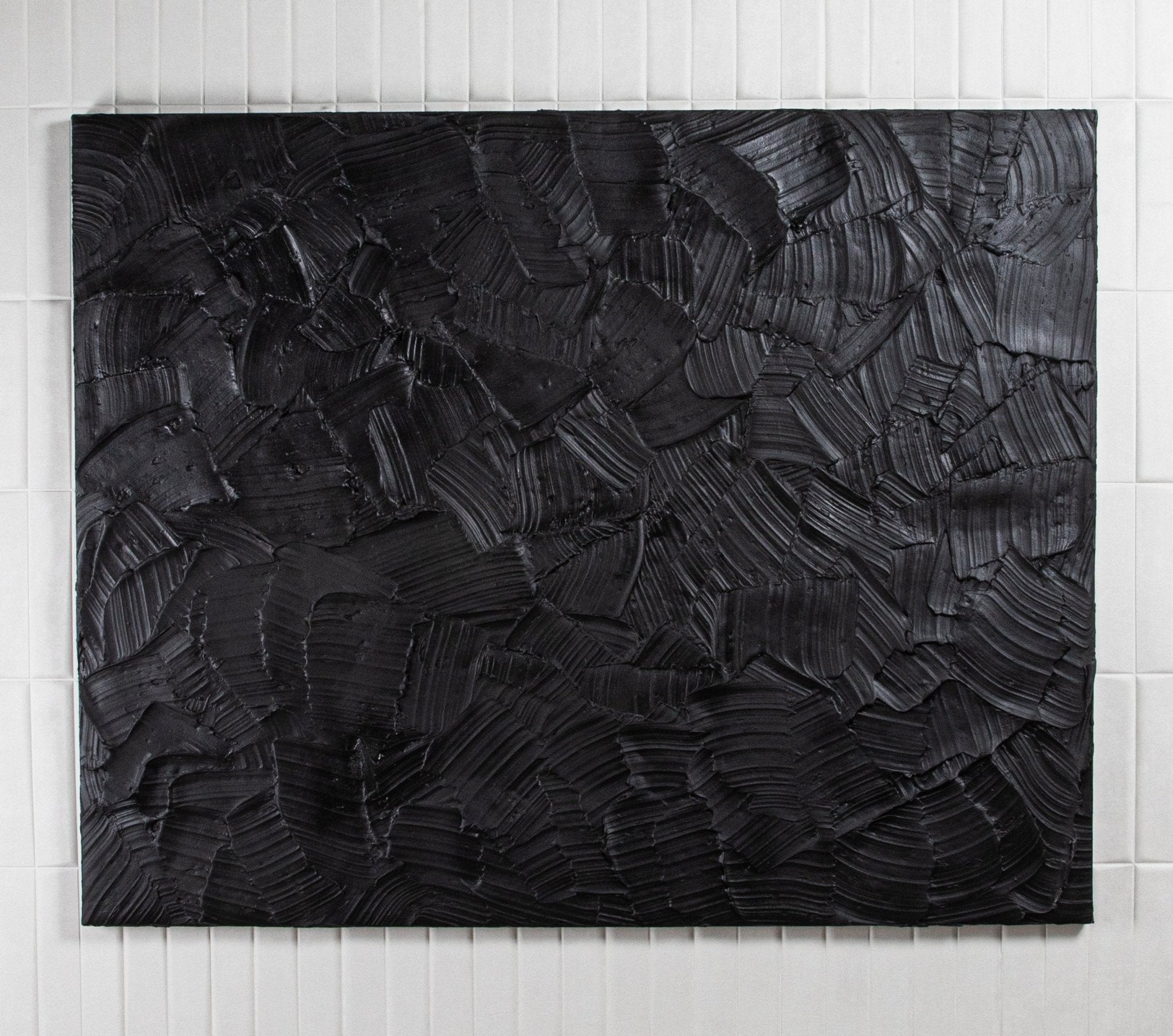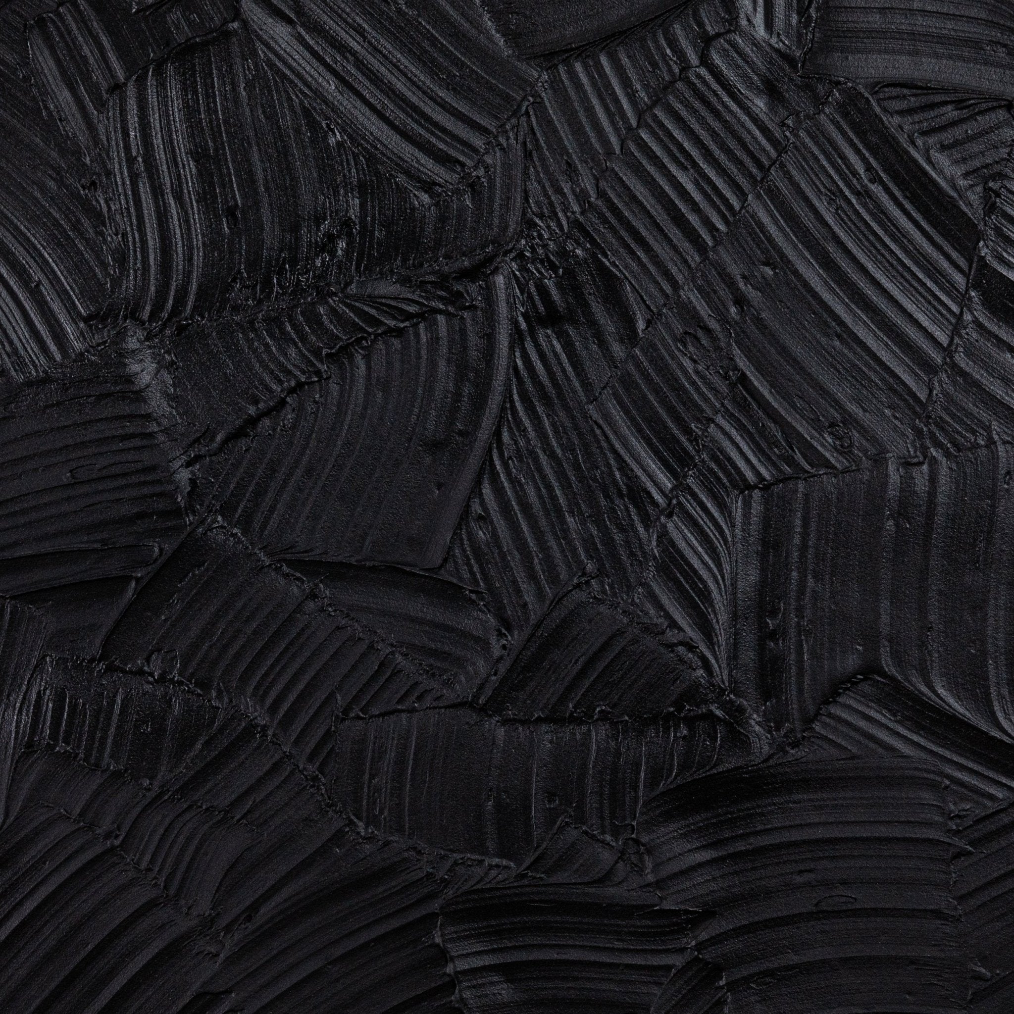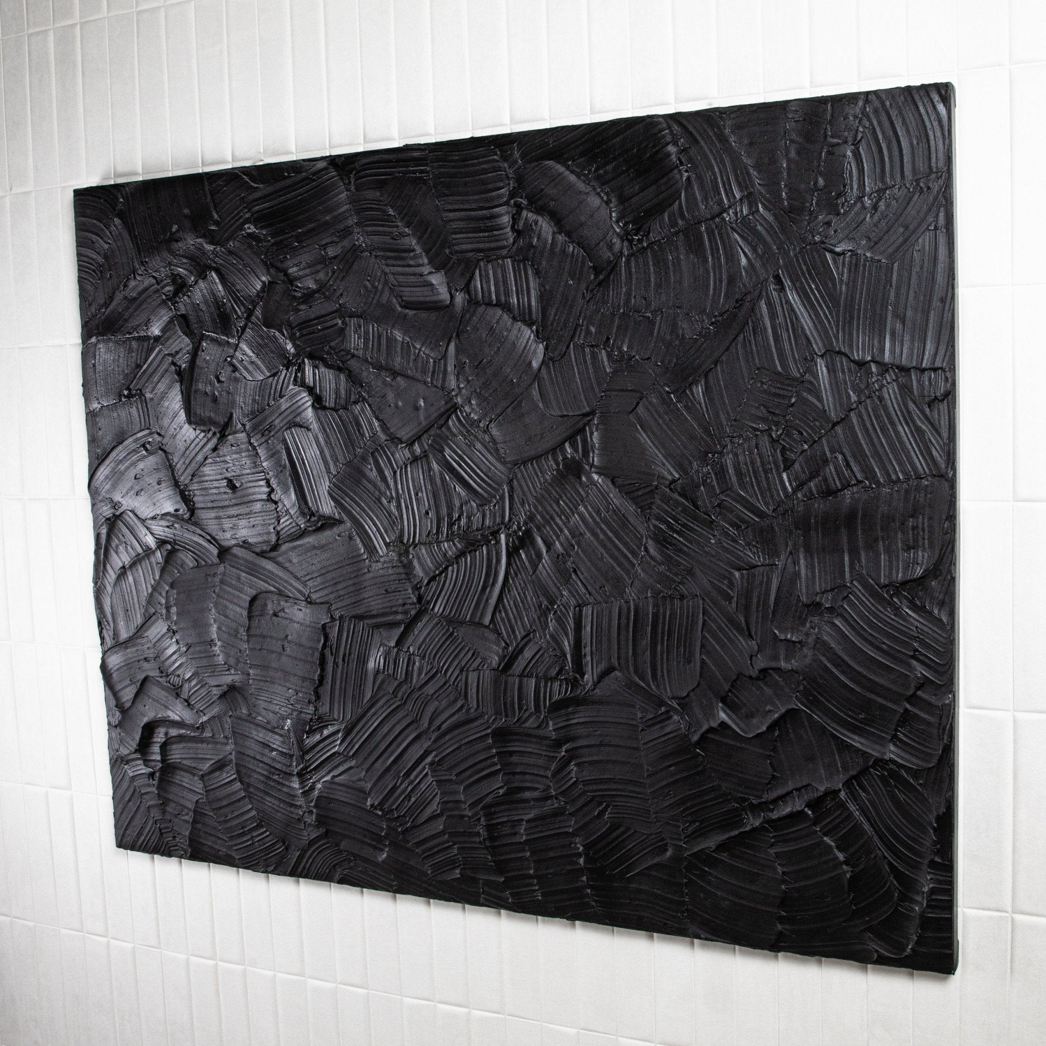 A captivating exploration of depth and dimension, this abstract textural painting by Michael Allen is a striking statement of modern artistry. Executed on a wood panel, the composition features bold, sculptural layers that interplay with light and shadow, creating a dynamic visual rhythm. The monochromatic palette intensifies the tactile quality of the piece, drawing the viewer into its intricately layered surface.