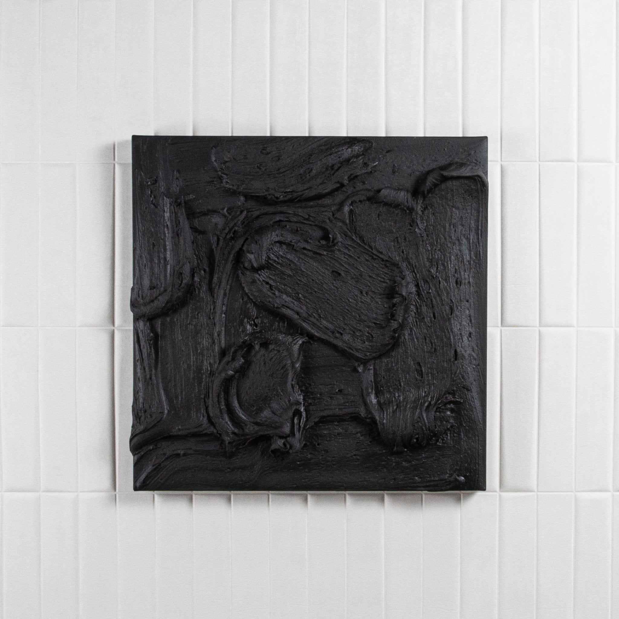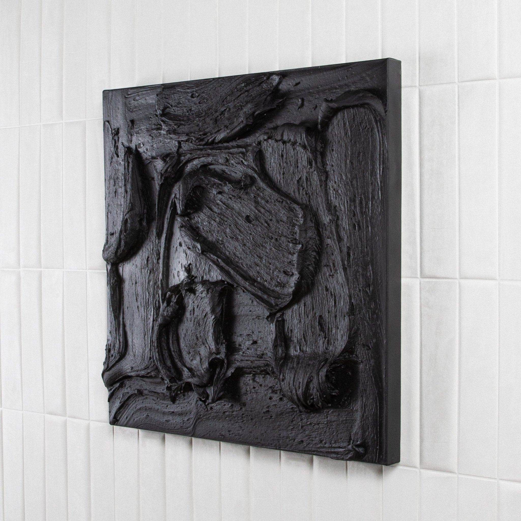 A captivating exploration of depth and dimension, this abstract textural painting by Michael Allen is a striking statement of modern artistry. Executed on a wood panel, the composition features bold, sculptural layers that interplay with light and shadow, creating a dynamic visual rhythm. The monochromatic palette intensifies the tactile quality of the piece, drawing the viewer into its intricately layered surface.