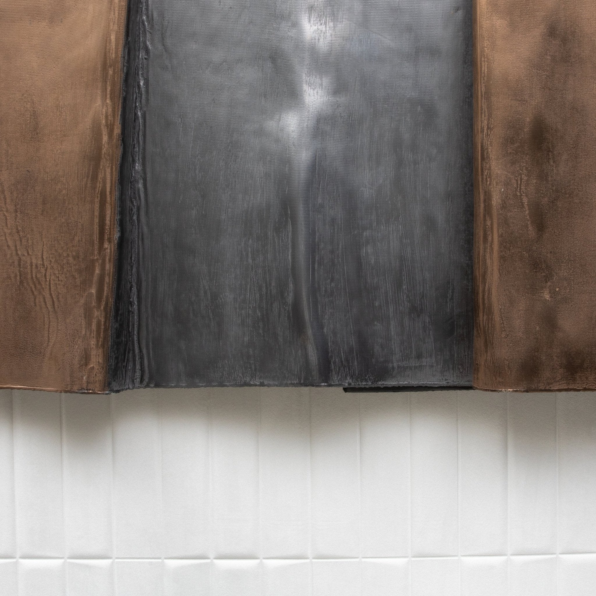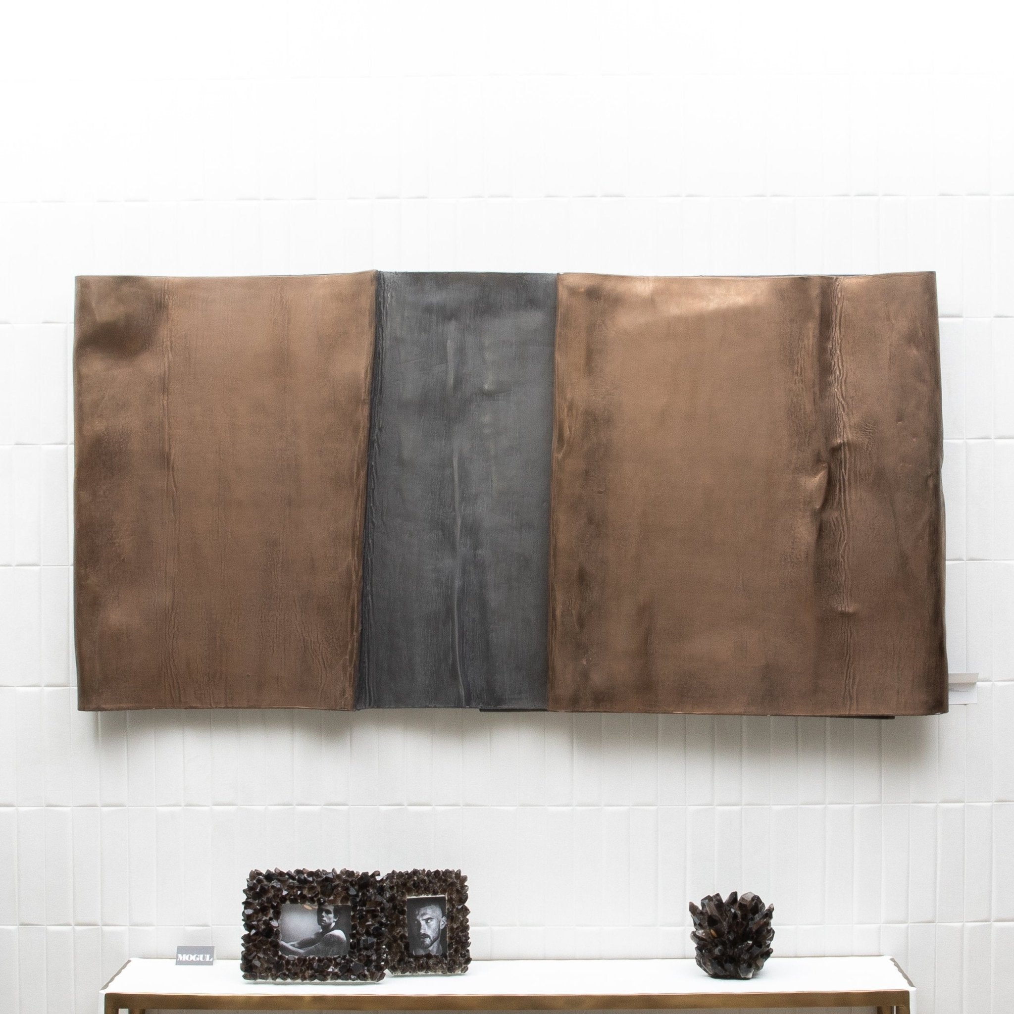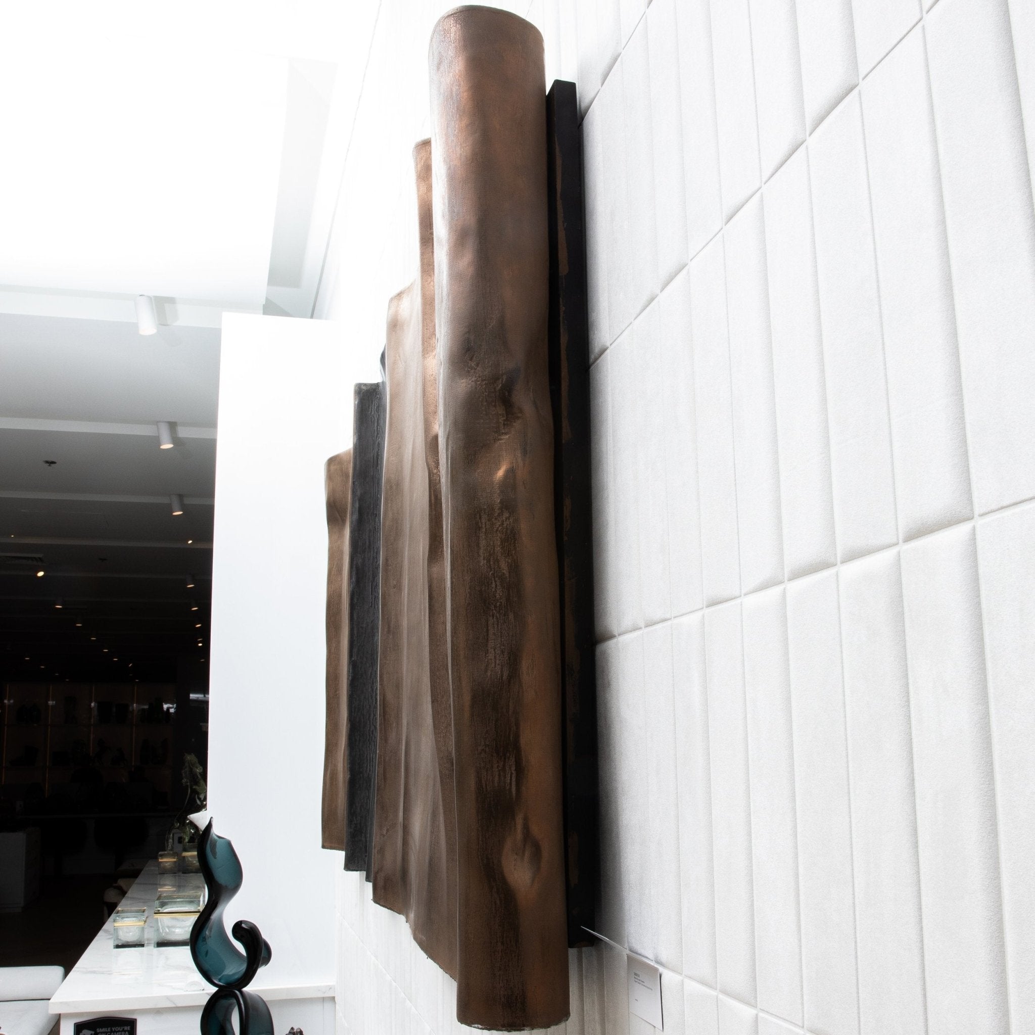 The "Wave Series" by Katrien Van der Schueren is a captivating exploration of contrast, perception, and materiality. Hand-sculpted from concrete and liquid bronze, this piece embodies the fluidity and organic nature of ocean waves. The use of liquid bronze, paired with concrete, creates an illusion of flexibility and movement, especially as the light reflects and shifts across the surface. Inspired by the serene California landscape and the ever-changing nature of life, this one-of-a-kind artwork blends texture with reflective qualities to evoke a sense of both calm and motion. Each piece in the series is unique and signed, offering collectors an extraordinary sculptural work that plays with light and material. Crafted with a stretcher bar and Z-bar for easy hanging, this piece is a perfect fusion of modern art and natural inspiration.