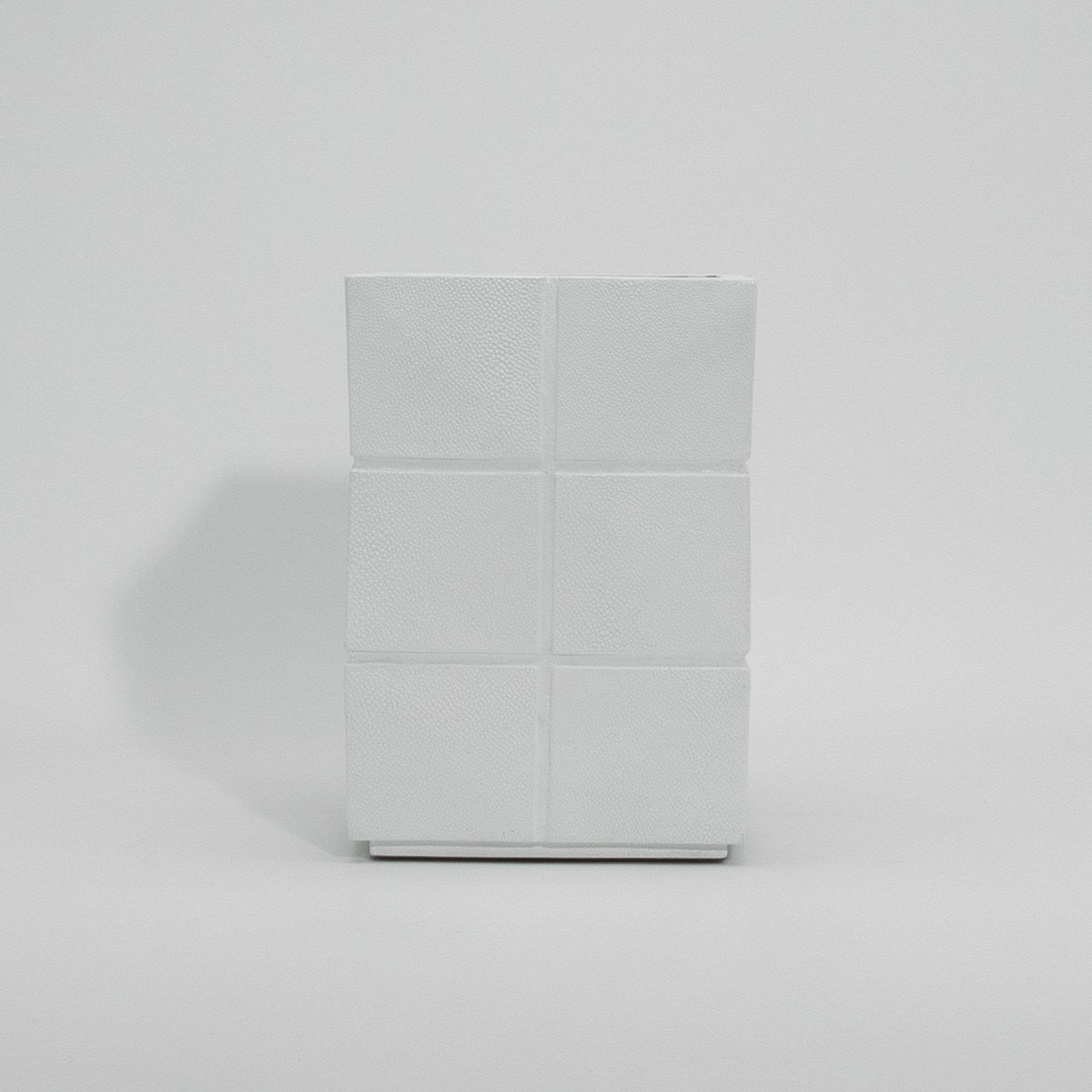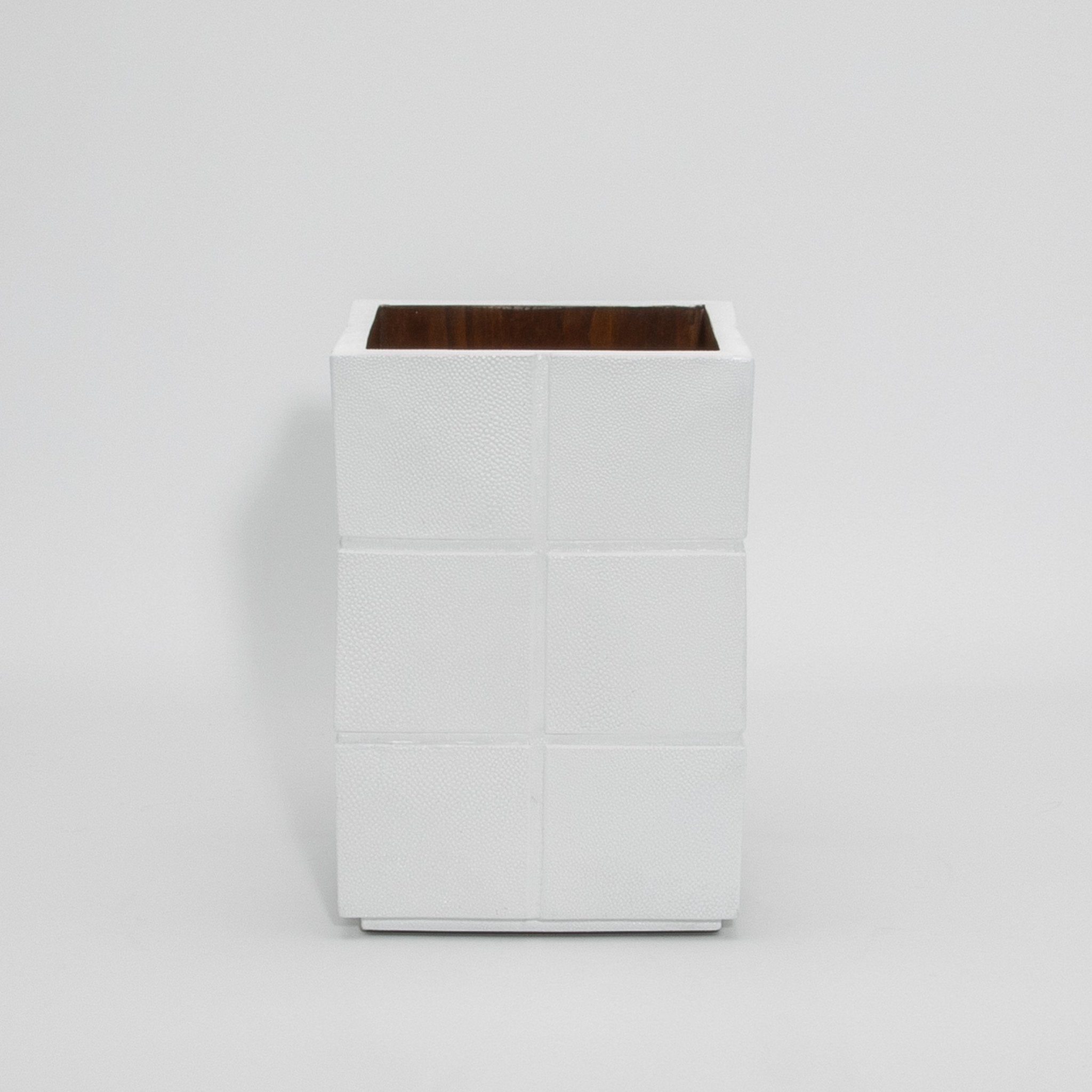 The White Shagreen Rhomboid Waste Bin by R&Y Augousti is a masterpiece of functional design, combining luxurious materials and artisanal craftsmanship. Its exterior is adorned with meticulously hand-applied shagreen, creating a tactile surface with a subtle, sophisticated texture. The waste bin's distinctive rhomboid design adds a geometric elegance, making it a striking addition to any high-end interior. The interior is thoughtfully lined with polished wood, offering a seamless blend of practicality and refinement. Every detail of this piece reflects the impeccable skill of master artisans, ensuring it stands out as both a decorative and functional element in your space. Perfect for those who appreciate understated luxury, this waste bin exemplifies timeless sophistication.