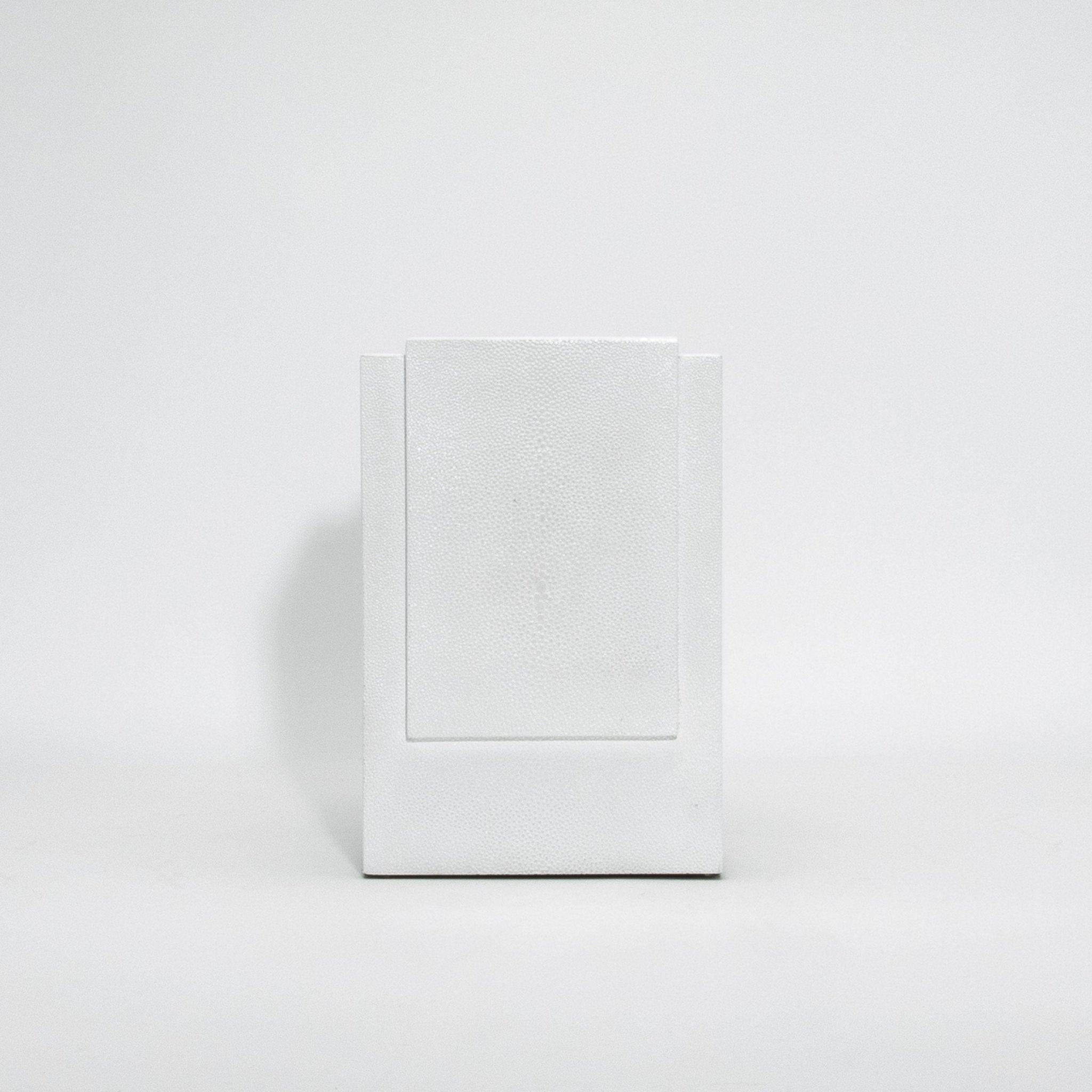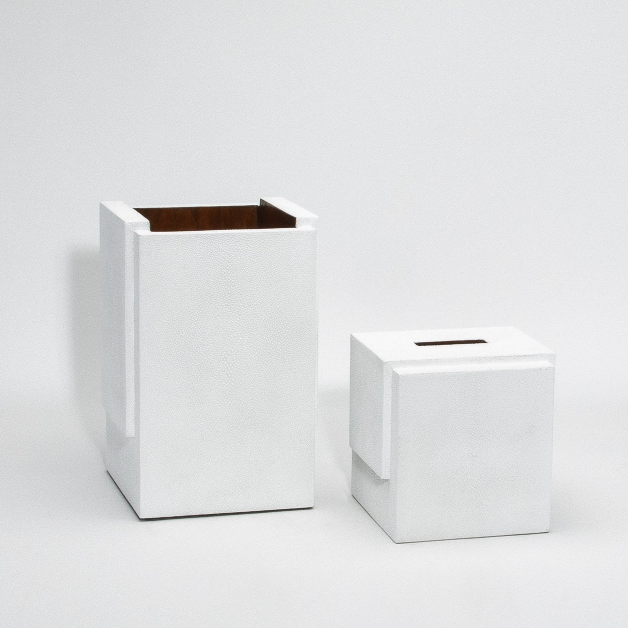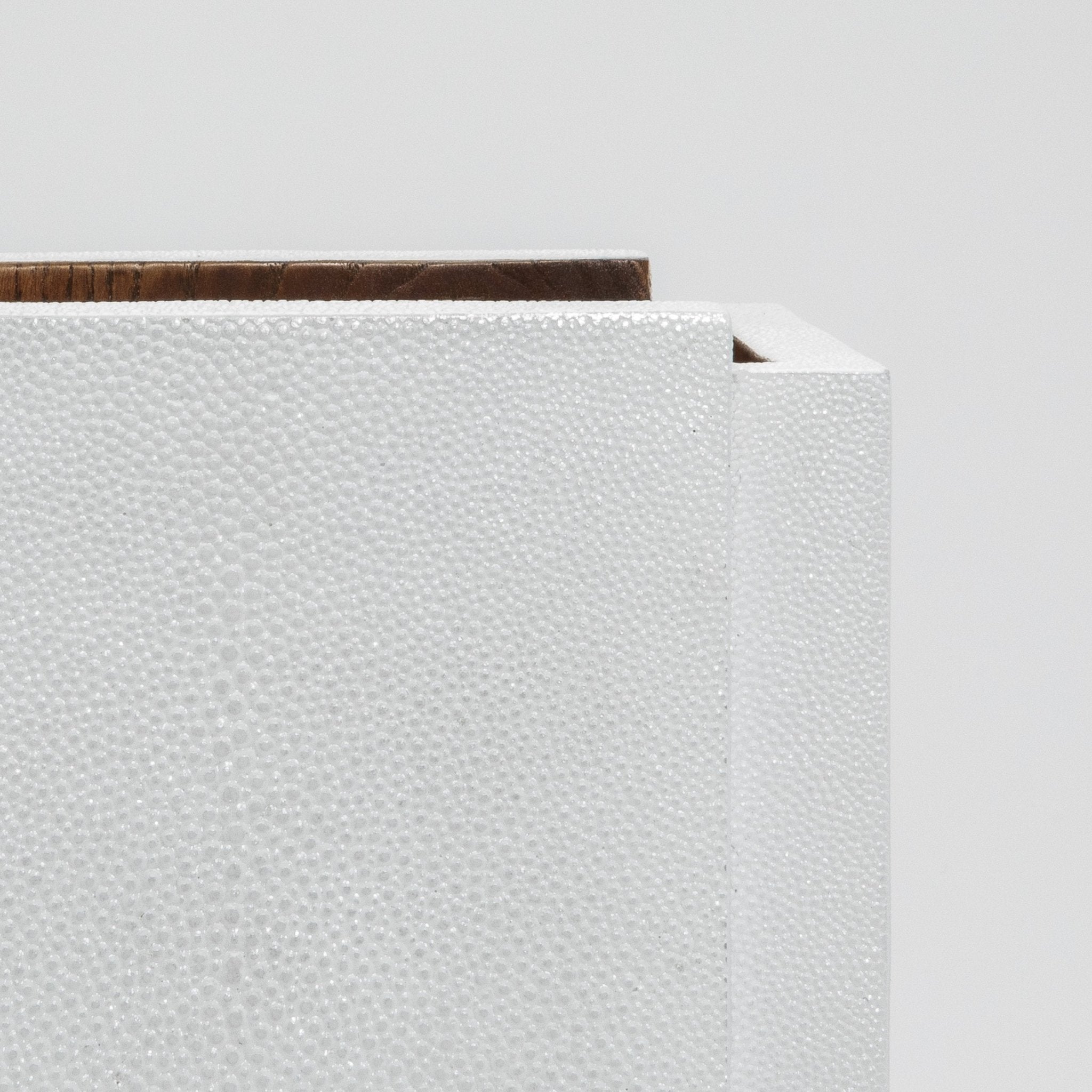 The White Shagreen Waste Bin with Wood Interior by R&Y Augousti is a stunning blend of luxurious craftsmanship and functionality. Its exterior, crafted from hand-selected shagreen, boasts a rich, textured finish that exudes sophistication, while the polished wood interior provides a warm and refined contrast, ensuring both durability and ease of maintenance. Meticulously handcrafted by skilled artisans, every detail of this piece is seamlessly executed, from the perfectly aligned panels to the smooth interior lining. Designed to elevate any space, this waste bin transforms a functional item into a statement of elegance, making it an ideal addition to luxury bathrooms, executive offices, or modern living areas.