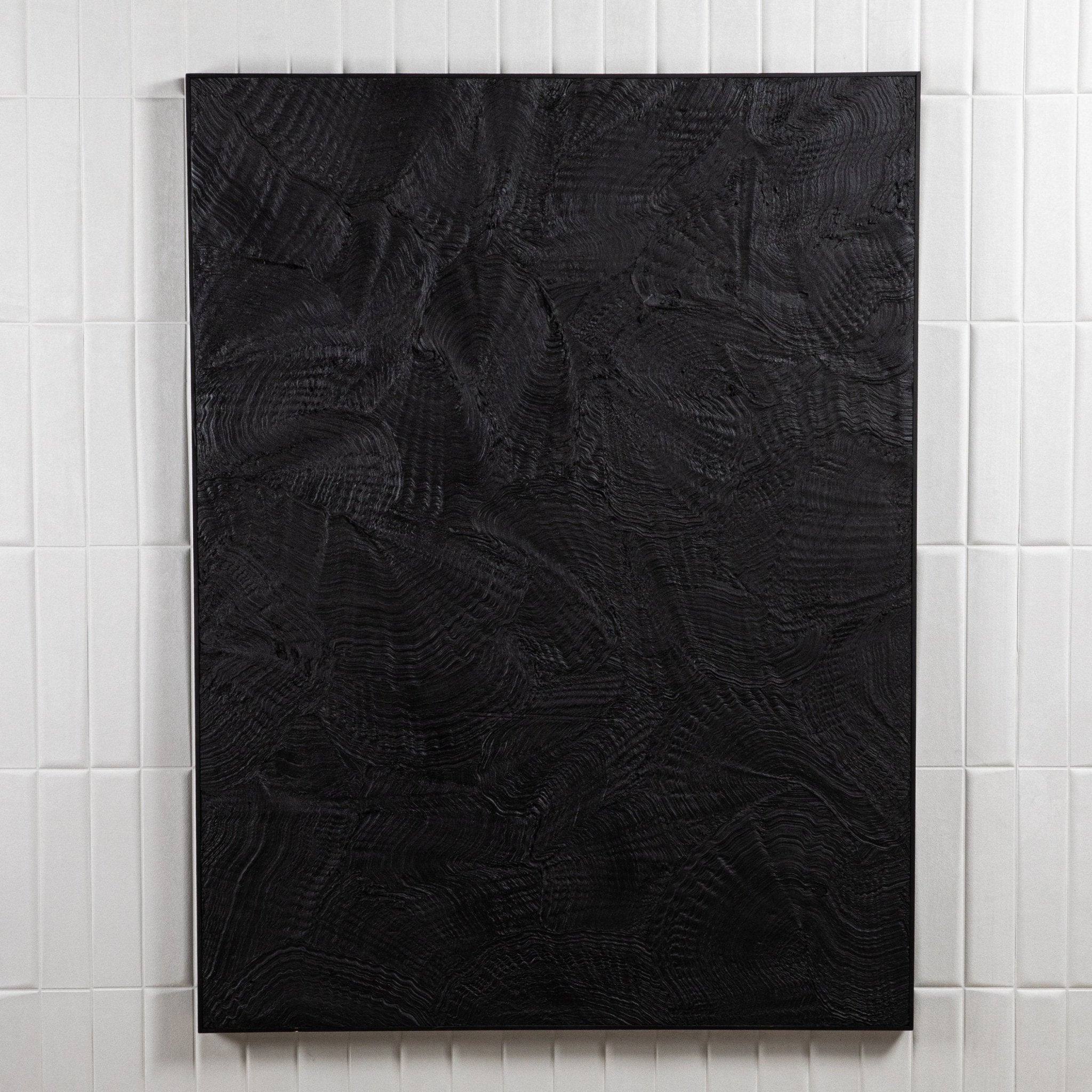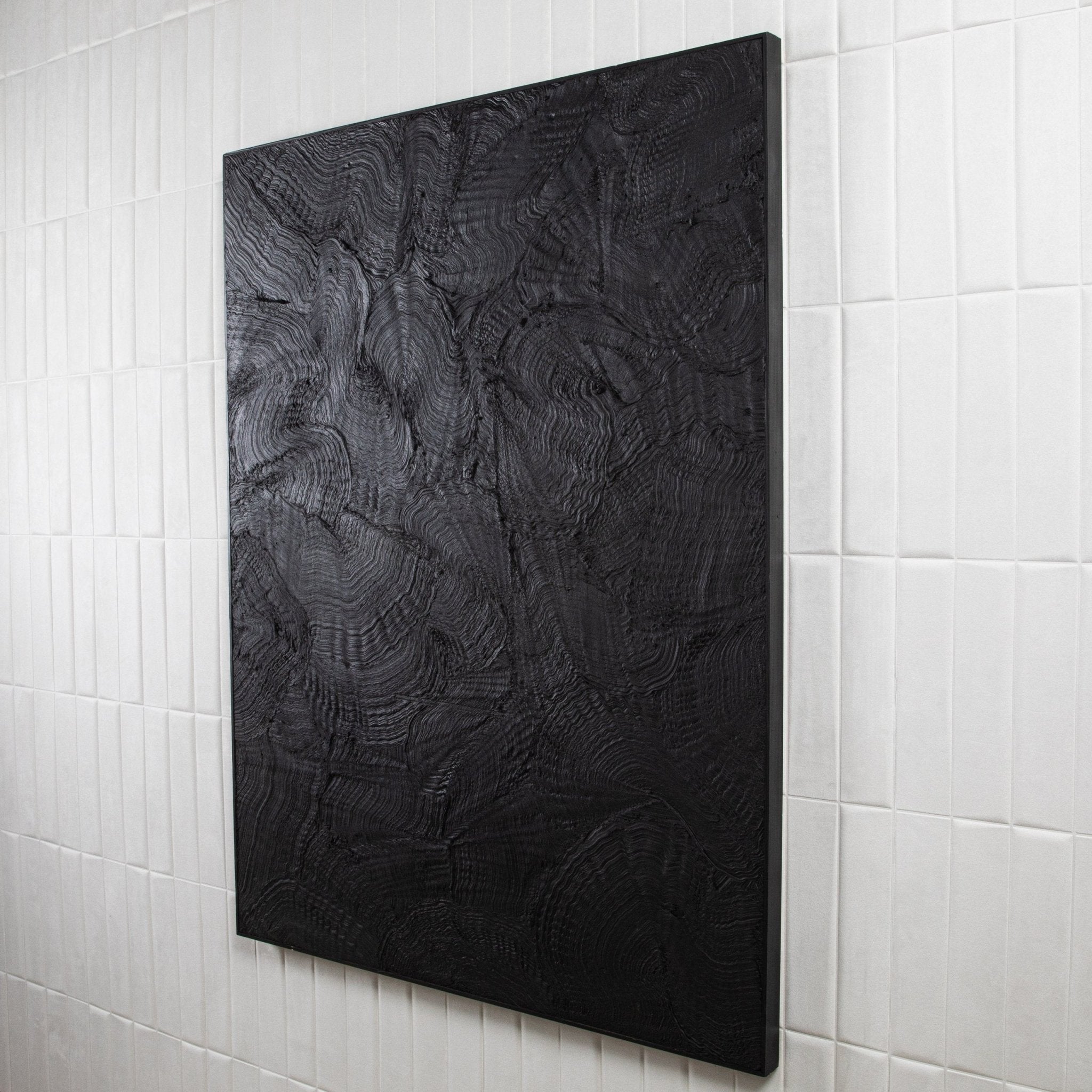 A captivating exploration of depth and dimension, this abstract textural painting by Michael Allen is a striking statement of modern artistry. Executed on a wood panel, the composition features bold, sculptural layers that interplay with light and shadow, creating a dynamic visual rhythm. The monochromatic palette intensifies the tactile quality of the piece, drawing the viewer into its intricately layered surface.